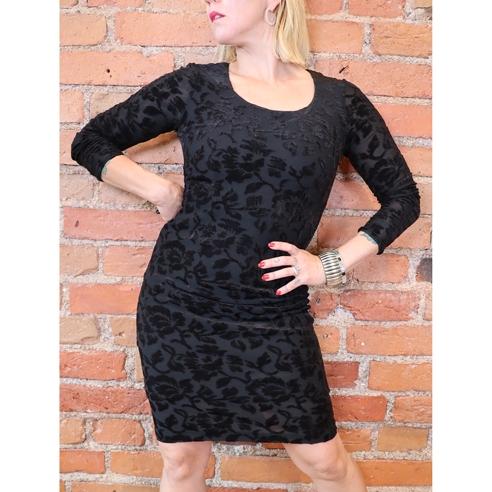 Todella kaunis ja hurmaava 5th Avenue -merkkinen musta samettimekko 90-luvulta. Ei valmistusmaatietoja. Muotokielen ja tuotelappujen perusteella valmistettu 1990-luvulla. Valmistettu mustasta trikookankaasta, jossa pinnalla samettinen kukkakuosi. Ajaton, kotelomekkomallinen mekko, jossa laakea pyöreä pääntie. Täysptkät hihat. Miehustaosa vuoritettu, hihat kuultavat läpi. Ei kiinnitysmekanismia – päälle vedettävä malli. Erittäin hyväkuntoinen, kaunis ja monikäyttöinen musta samettimekko ympärivuotiseen käyttöön!
