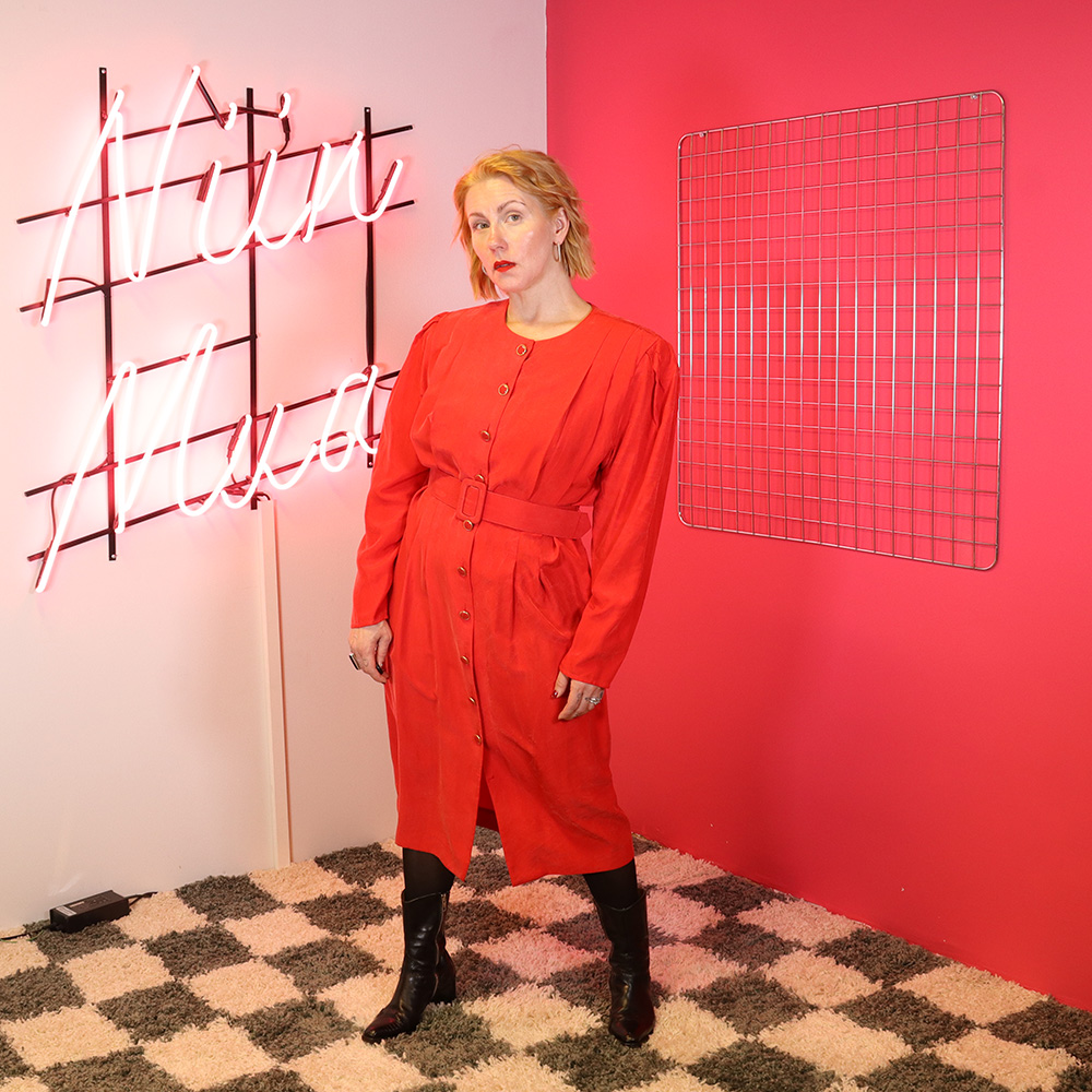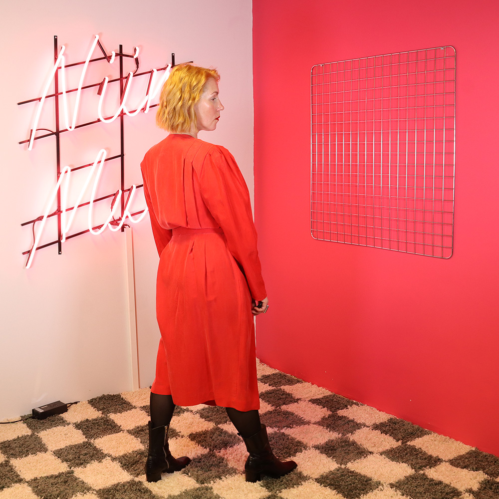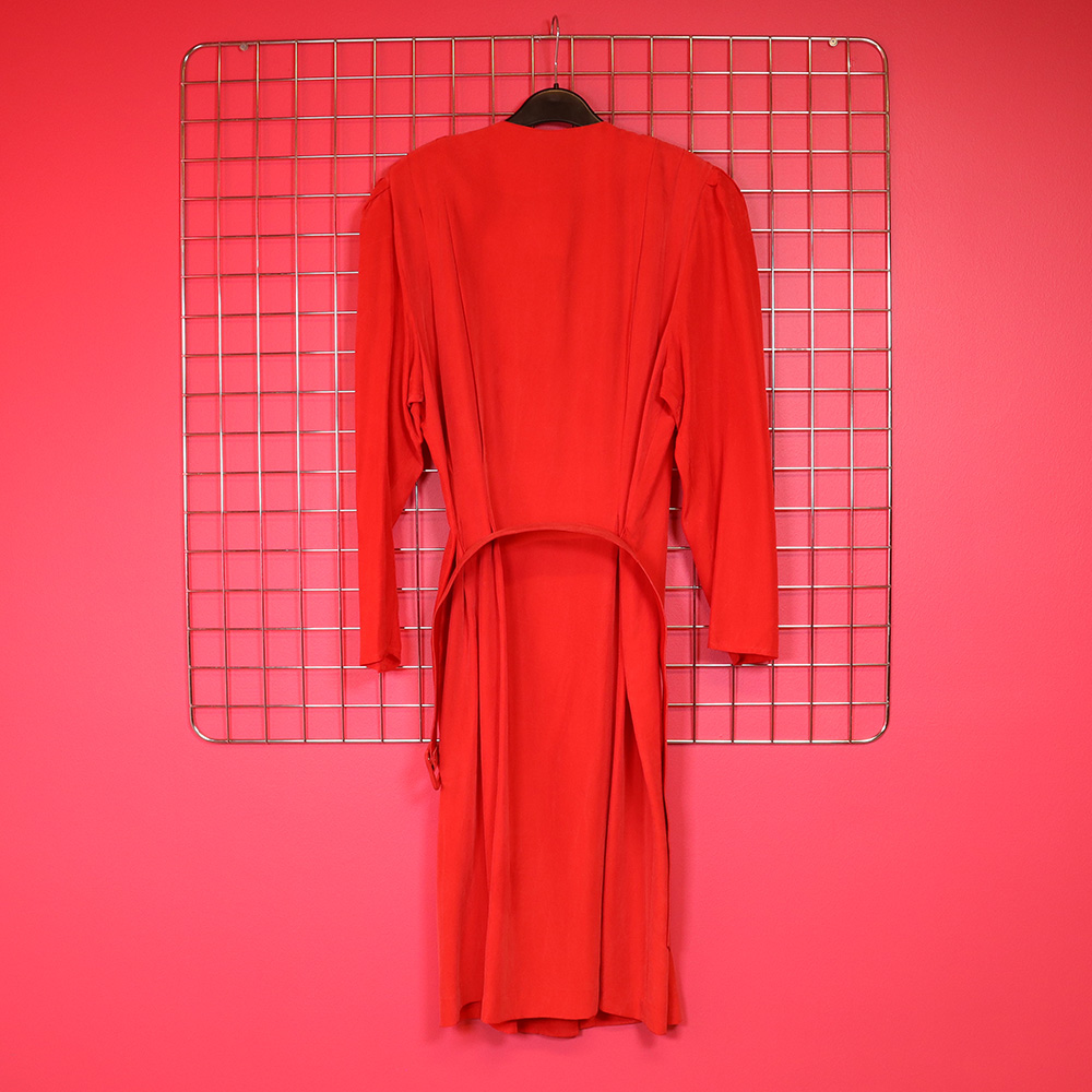 Adrianna Papéll -merkkinen näyttävä ja kaunis punainen silkkimekko 80-luvulta. Valmistettu Hongkongissa. Valmistettu oranssiin taittavasta punaisesta silkkikankaasta. Näyttävä power dress -mallinen mekko, jossa näyttävät laskostukset sekä hihoille että miehustaan. Vyötärökorkeudelta sisäänotettu. Yksirivinen kiinnitys näyttävillä napeilla. Mekkoon kuuluu samasta kankaasta valmistettu, kovitettu kiristyssoljellinen vyö. Runsaat olkatoppaukset, jotka voi halutessaan poistaa. Silkin pinnassa luonnollista värihaalistumaa ja alin nappi puuttuu, muutoin erittäin hyväkuntoinen ja näyttävä punainen silkkimekko ympärivuotiseen juhlakäyttöön!