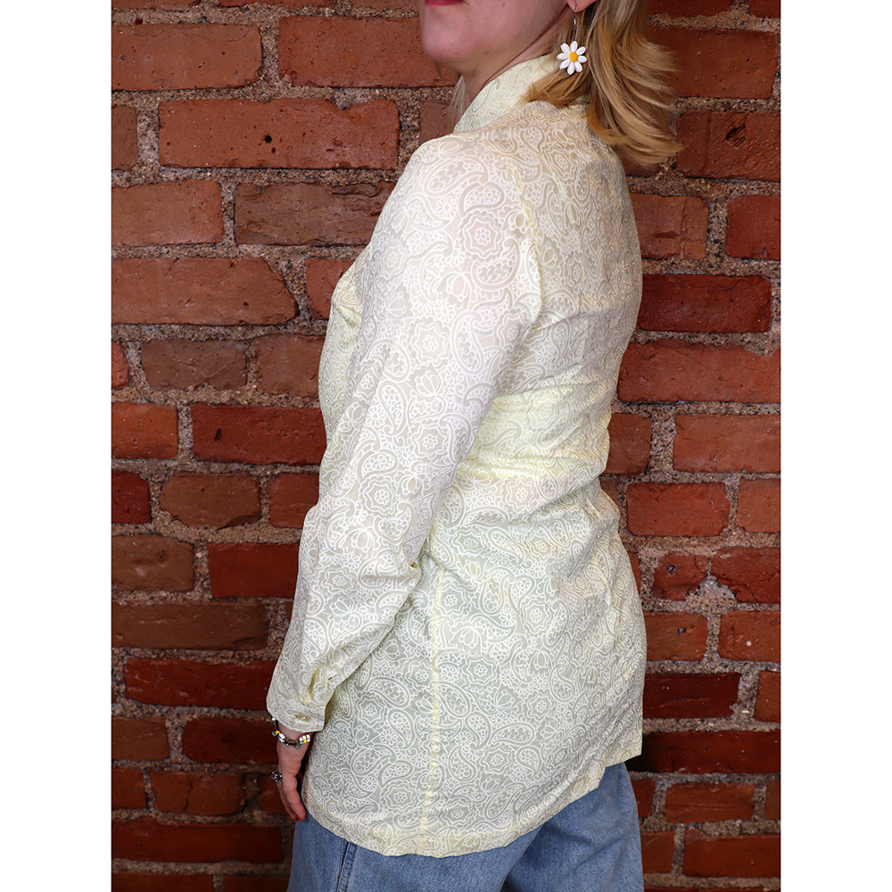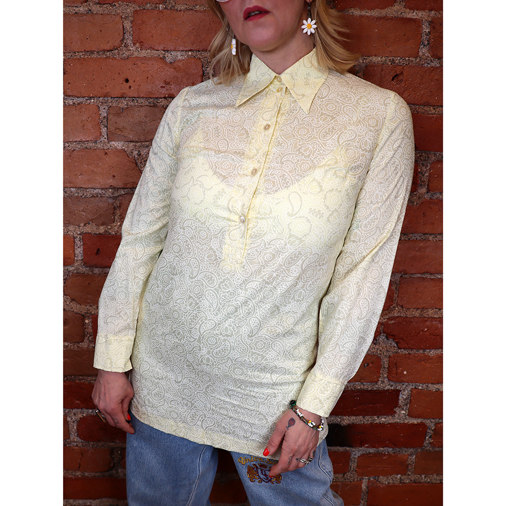 Todella hurmaava, Tampereen Trikoo Oy:n Aino -tuotemerkille Suomessa valmistama vintage-paita 60-luvulta. Paita on ostettu vanhan vaatekaupan jäämistöstä, joten se on täysin käyttämätön. Paita vielä alkuperäisessä laatikossa. Valmistettu sileästä, kevyestä ja hieman läpikuultavasta puuvillasekoitteesta, jossa hurmaava paisley- ja kukkakuosi. Puuvillasekoitetta tunnun ja ulkonäön perusteella, ei materiaalitietoja. Kuosin sävyinä vaaleankeltainen ja valkoinen. Pitkähihainen ja pitkä kauluspaitamalli, jossa napitus rinnan alle. Napitus ranteella. Muotolaskokset rinnalla ja takaolalla. Pieni tasku sivusaumassa. Suora helma. Käyttämätön, kaunis ja ihastuttava vintage-paita 60-luvulta!