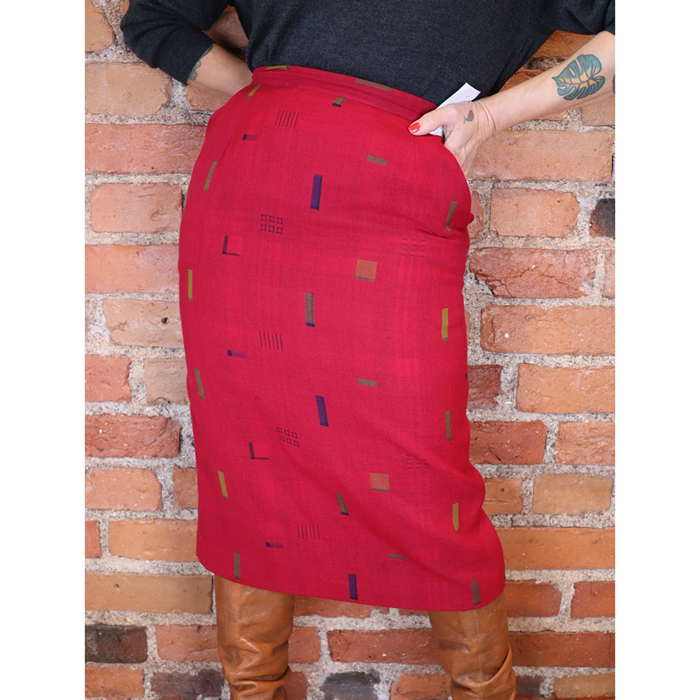 Arola Oy:n Suomessa 80-luvulla valmistama punasävyinen villakangashame. Ihana kuosi, joka sopii täydellisesti myös nykypäivän trendeihin. Valmistettu korkealaatuisesta villakankaasta, 100% puhdasta uutta villaa. Puolipitkä malli, jossa etutaskut, takahalkio ja kiinnitys keskitakasaumassa vetoketjulla ja napilla. Kokonaan vuoritettu viskoosikankaalla. Erittäin hyväkuntoinen, Suomessa valmistettu Arola-hame. Lämmin ja miellyttävä yllä.