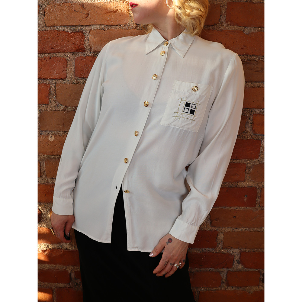 Brandtex-merkkinen todella kaunis valkoinen viskoosipaita 90-luvulta. Ei valmistusmaatietoja. Valmistettu kauniisti laskeutuvasta ja hengittävästä viskoosikankaasta, jonka sävynä kananmunankuoren valkoinen. Ajaton kauluspaitamalli, jossa kauluskäänteet ja pitkät hihat, joilla hihansuunkäänteet. Kiinnitys koristeellisilla, kullanvärisillä napeilla. Rintataskulla koristeellinen kirjailu ja kullanvärinen nappikiinnitys. Helmassa pieni varastoinnissa ilmaantunut tahra (ei ole yritetty pestä pois), muutoin erittäin hyväkuntoinen, kaunis ja ajaton valkoinen viskoosipaita arkeen ja juhlaan!