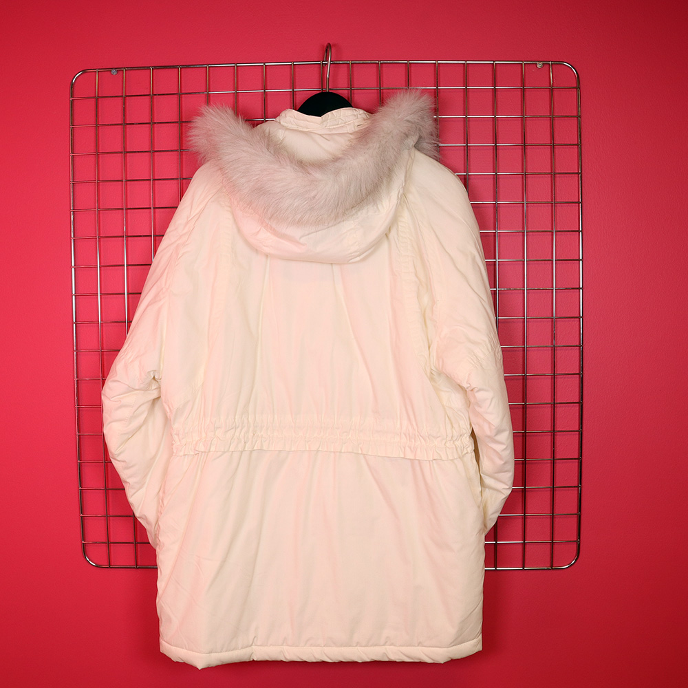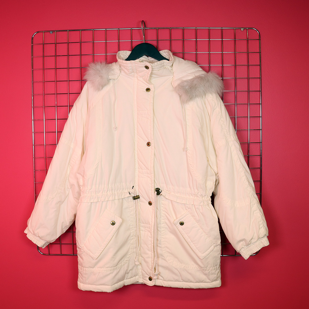 Cape Cod -merkkinen näyttävä, valkoinen toppatakki 90-luvulta. Valmistettu Kiinassa. Pulipitkä, unisex-malli, jossa runsaasti toiminnallisia yksityiskohtia. Läpälliset etutaskut, kiristysnyörit vyötärökorkeudella ja irrotettava tekoturkissomisteinen huppu. Vetoketjukiinnityksen päällä nepparikiinnitteinen lista. Erittäin hyväkuntoinen ja raikas valkoinen toppatakki unisex-käyttöön!
