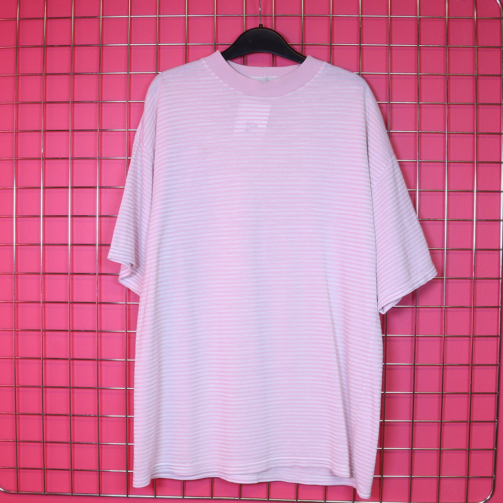 Classic Boys -merkkinen huikea, raidallinen T-paita 80-luvulta. Valmistettu Tanskassa. Raitakuosissa valkoista ja vaaleanpunaista, valkoinen kuultaa hieman läpi. Pääntiellä vaaleanpunaista joustinneulosta. Pientä nukkaa pinnassa, mutta muutoin täysin käyttökelpoinen raitateeppari unisex-käyttöön.