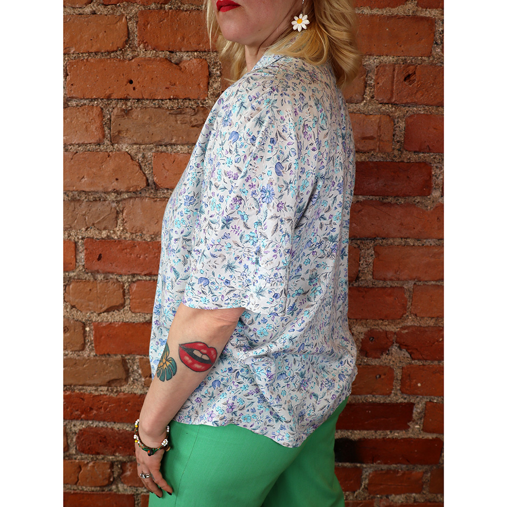 Day and Day -merkkinen huikean hurmaava kukkapusero 80/90-luvulta. Valmistettu Suomessa. Valmistettu kauniisti laskeutuvasta ja hengittävästä viskoosikankaasta, jossa harmaalla pohjalla pieni, kylmänsävyinen kukkakuosi. Kuosin sävyinä sininen, violetti ja turkoosi. Pieni kauluskäänne. Lyhyet holkkihihat, nappikiinnitys. Erittäin hyväkuntoinen ja kaunis kotimainen kukkapusero arkeen ja juhlaan!