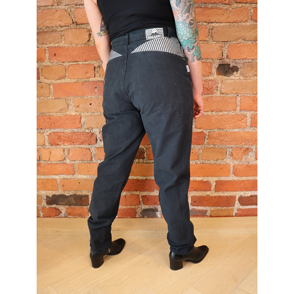 Diggers-merkkiset Suomessa valmistetut mustat housut 80-luvun lopulta / 90-luvun alusta. Valmistettu hieman joustavasta mustasta kankaasta. Taskujen sisällä ja takakappaleen kaarrokkeella brodeerattu raitayksityiskohta. Alaspäin kapeneva lahje, korkeahko vyötärökorkeus. Edessä sivutaskut. Väri hieman haalistunut, mutta yleisilmeeltään siisti ja monikäyttöiset kotimaiset, mustat housut.