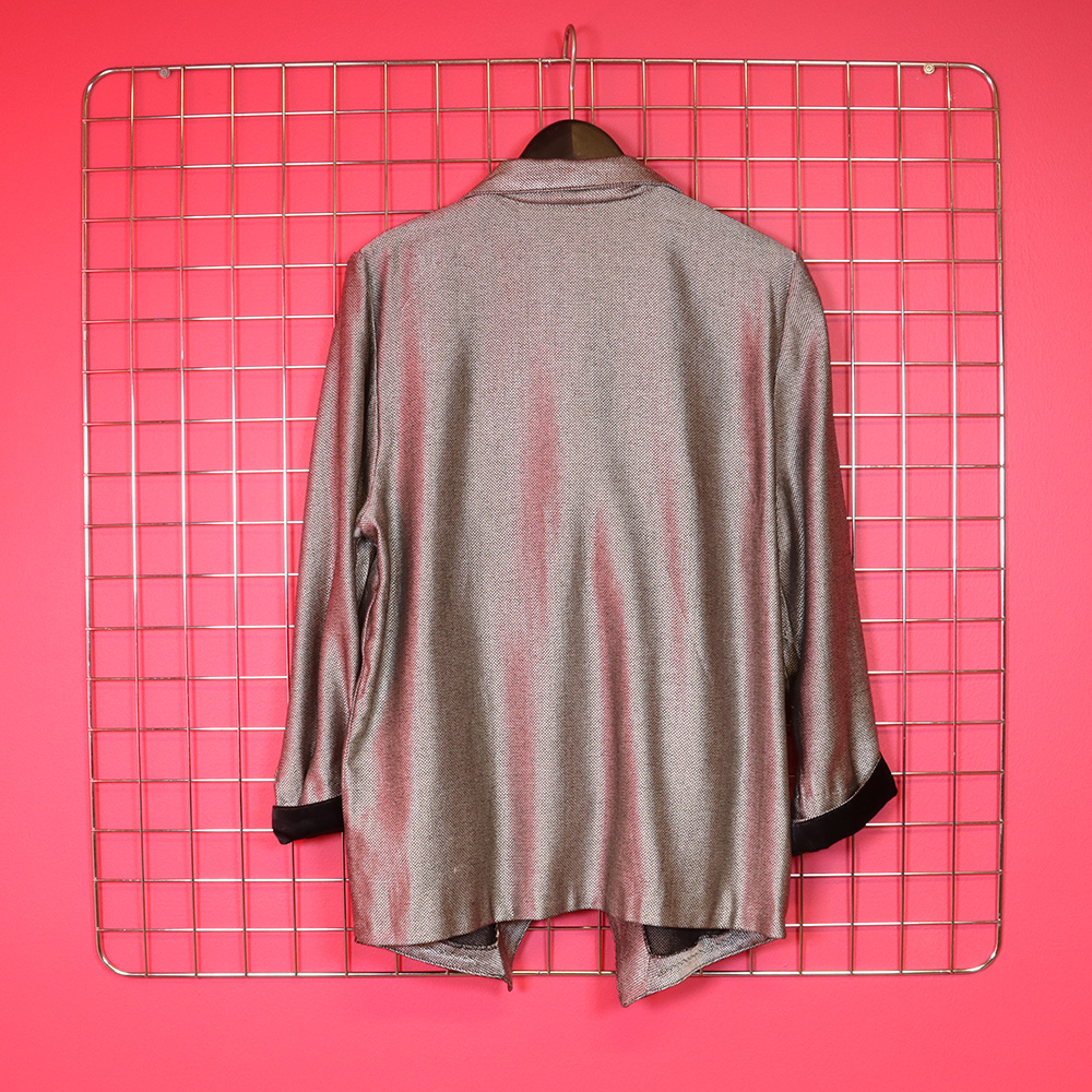 Erikois-Muoti Oy:n Helsingissä valmistama 80-luvun bleiseri. Valmistettu hopeanhohtoisesta kankaasta, jossa kaunis pintastruktuuri. Taskut- ja hihansuut mustat. Näyttävä bleiserimalli, jossa etuliepeet kulmikkaat. Herrainkaulukset. Kaksirivinen napitus. Ei vuorta. Olkatoppaukset poistettu, muutoin hyväkuntoinen ja näyttävä 80-luvun bleiseri.