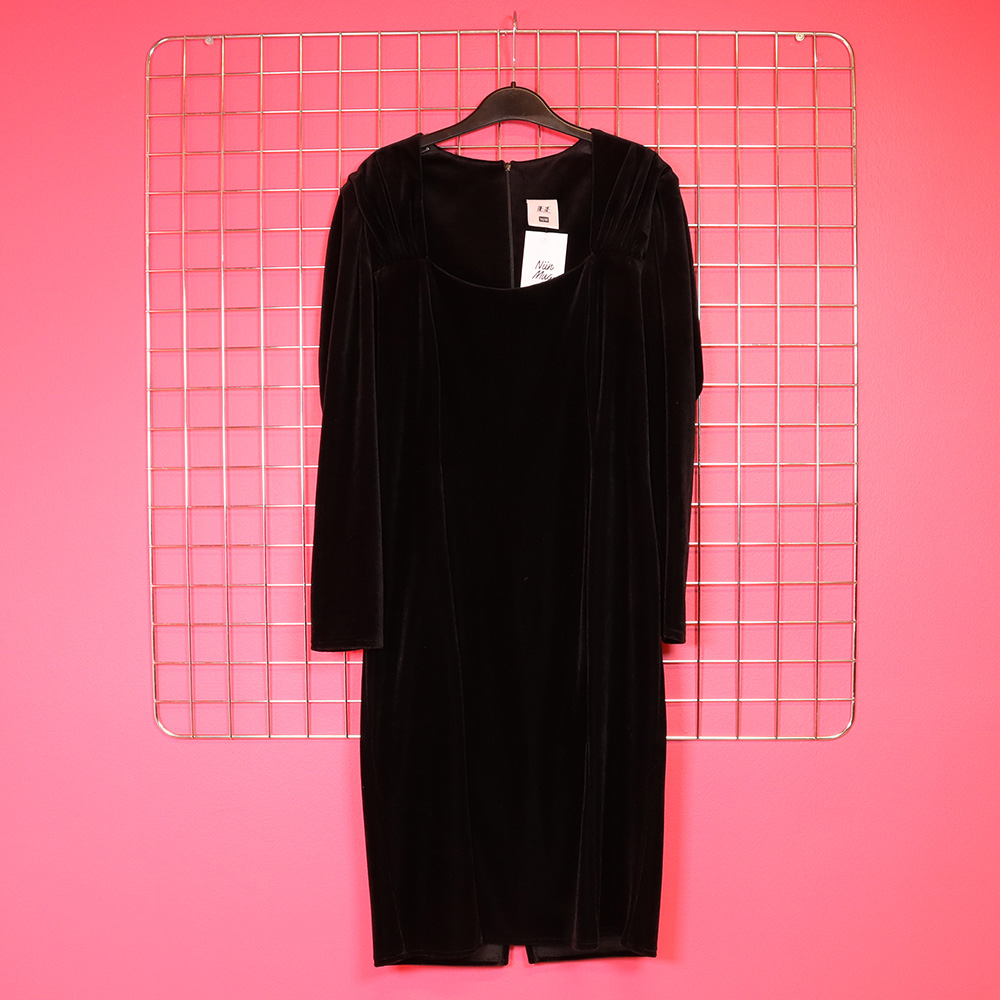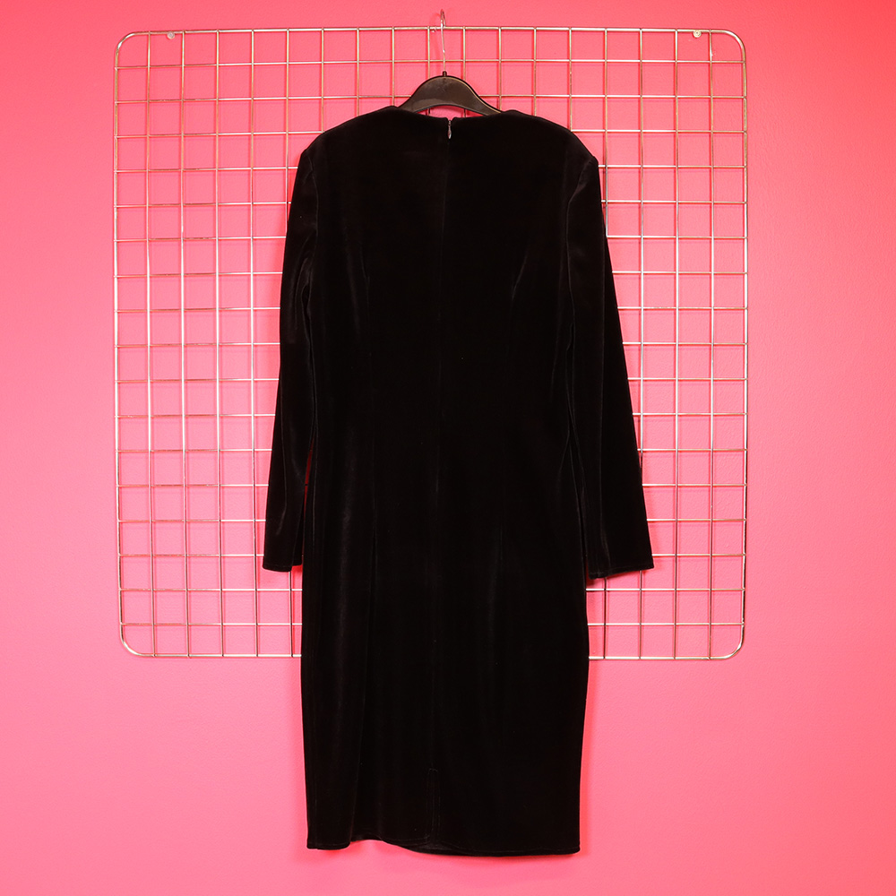 Eurofashion-merkkinen kaunis, musta kotelomekko 90-luvulta. Ei valmistusmaatietoja. Valmistettu hohtavapintaisesta samettitrikoosta, värinä musta. Upea, dramaattinen mekkomalli, jossa kantikas pääntie. Olalla kaunis drapeeraus. Kevyesti sisäänotettu, klassinen kotelomekkomalli. Pääntie vuoritettu. Erittäin hyväkuntoinen ja kaunis musta kotelomekko juhlakäyttöön!