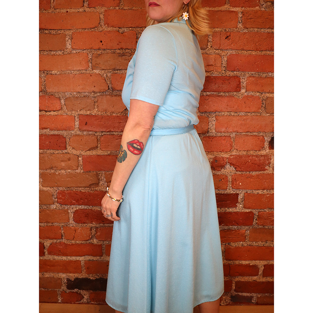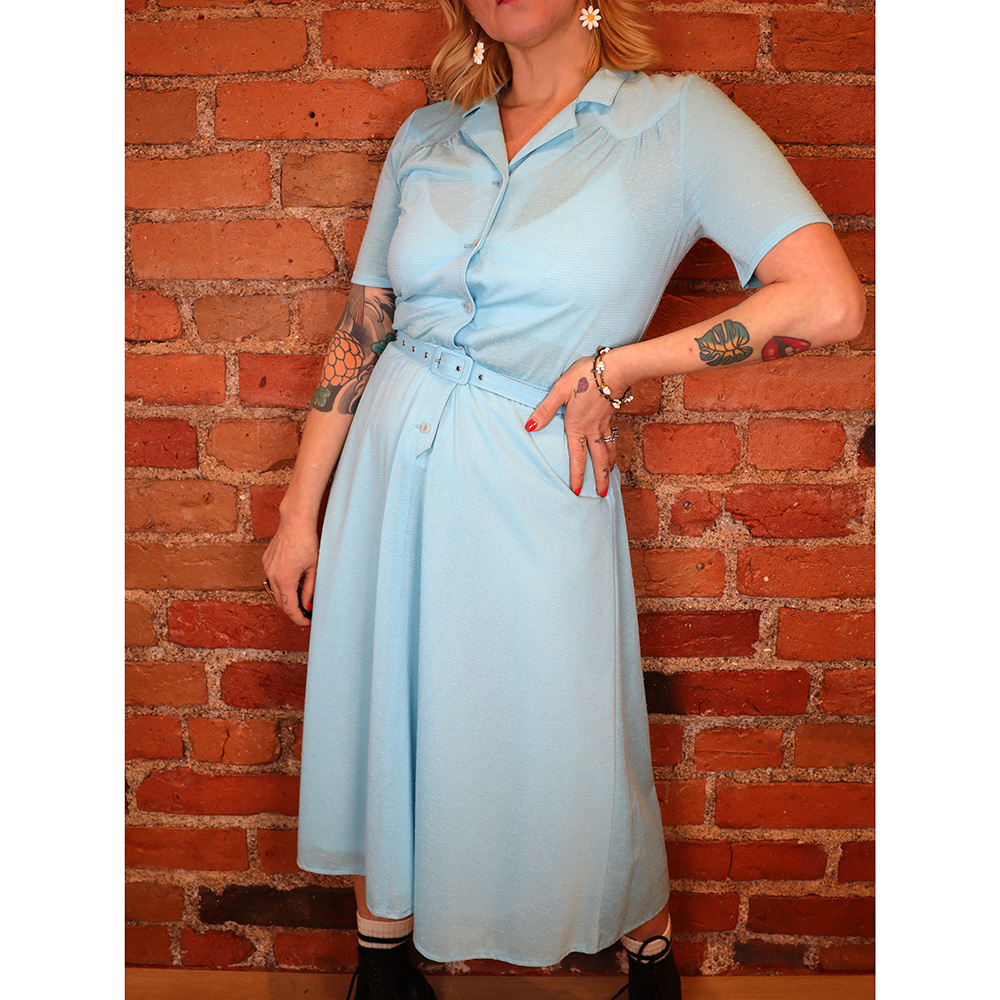 Kaunis ja raikas Virke Oy:n Finnkarelia-tuotemerkille valmistama kevyt, sininen vintage-mekko. Mekko on ostettu vanhan vaatekaupan jäämistöstä, joten se on täysin käyttämätön. Valmistettu kevyestä puuvilla-polyesteritrikoosta, jonka sävynä kirkas vaaleansininen. HUOM! Väri luonnossa tuotekuvaa hieman tummempi. Paitamekkomalli, jossa vyötäröllä poikkisauma ja kuminauha. Sivusaumoilla vyölenkit. Mekkoon kuuluu samasta kankaasta valmistettu, kovitettu soljellinen vyö. Pääntiellä pieni herrainkaulus ja olalla kauniit muotkaarrokkeet. Hameosa kokonaan vuoritettu. Nappikiinnitys keskiedussa lantiokorkeudelle. Todella upea ja käyttämätön, sininen vintage-mekko arkeen ja juhlaan!