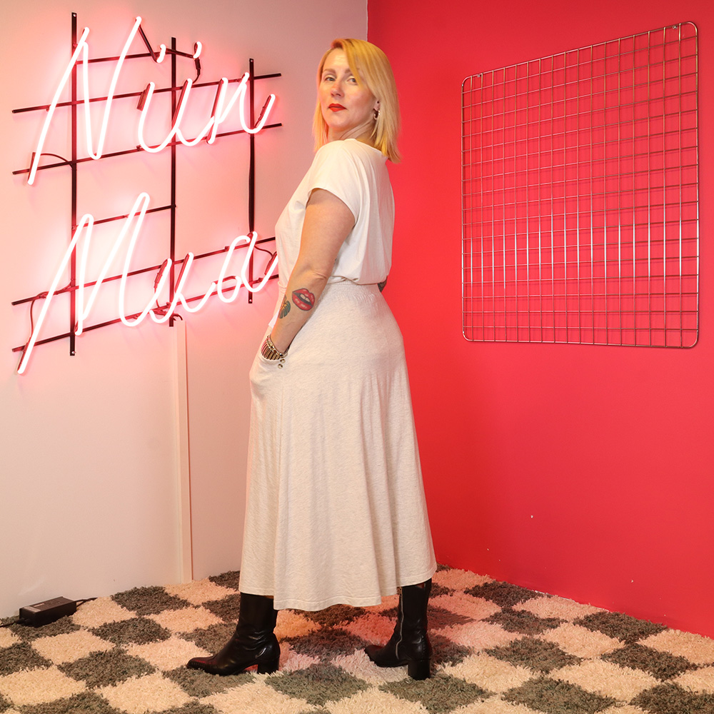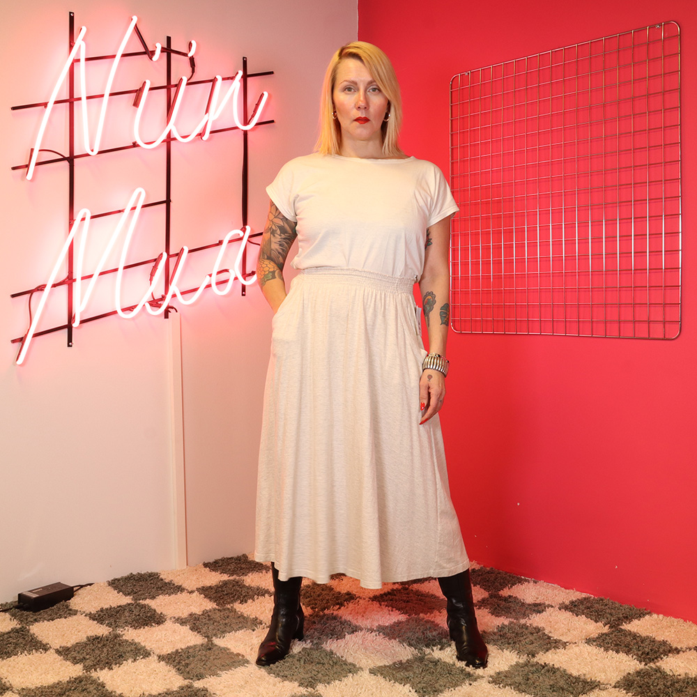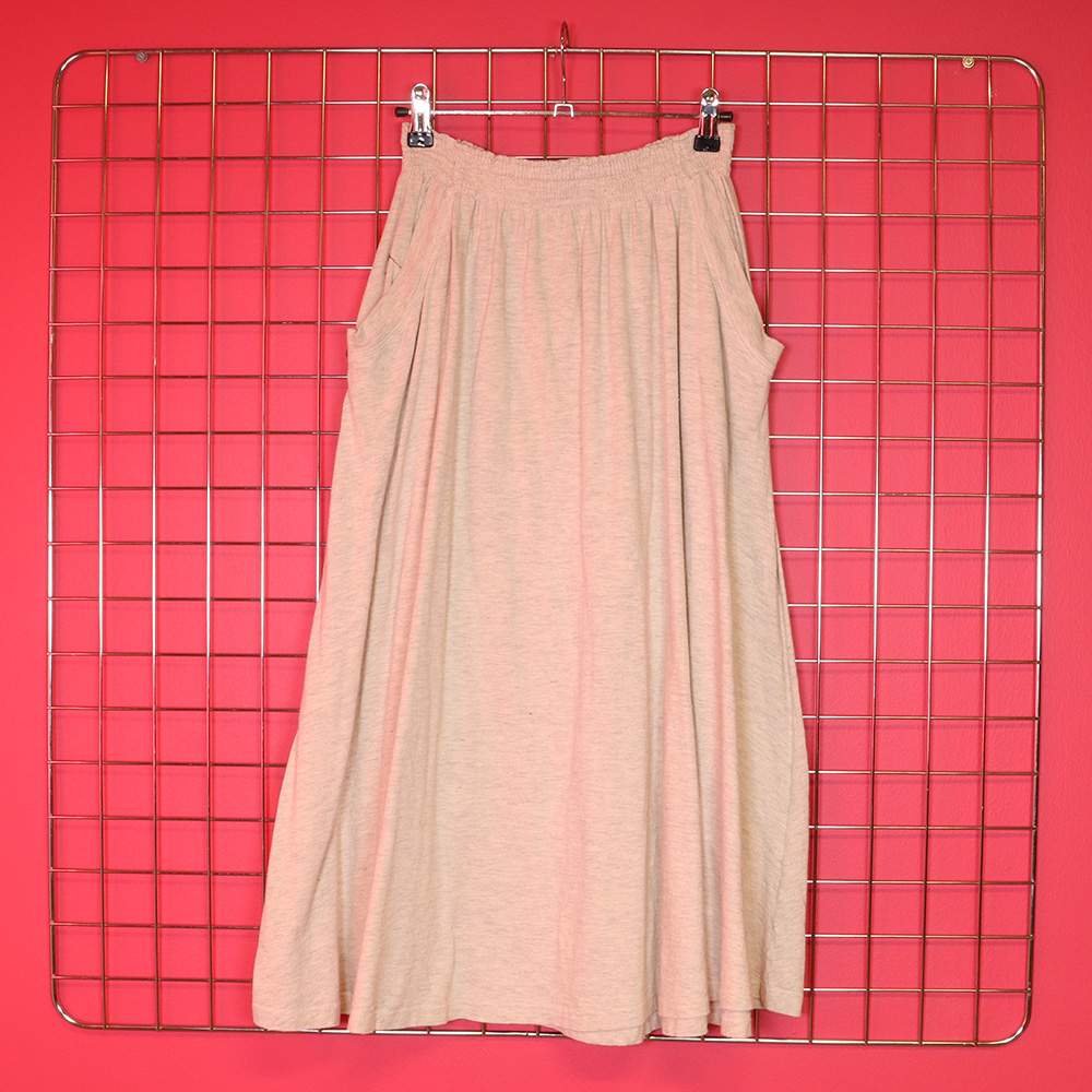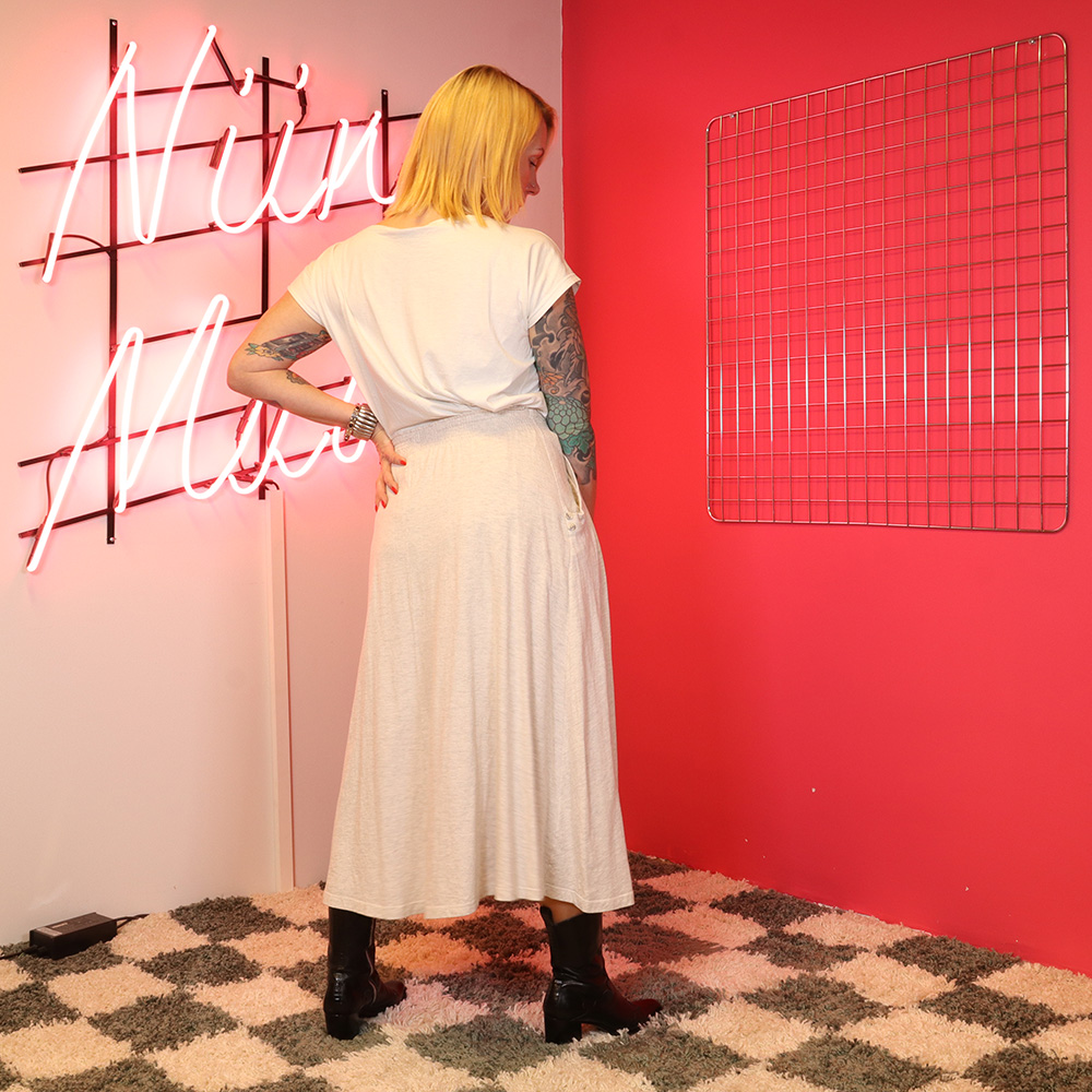 Finnwear Oy:n Suomessa 80-luvulla valmistama hurmaava trikoohame. Valmistettu meleeratusta valko-harmaasta trikookankaasta. Hengittävää puuvilla-viskoosisekoitetta. A-linjainen malli. Vyötärökaitale kokonaan kuminauhoitettu. Sivutaskut. Taskuilla pienet nappiyksityiskohdat. Pientä nukkaa pinnassa, muutoin erittäin hyväkuntoinen Finnwear-trikoohame kuumaan kesäpäivään!
