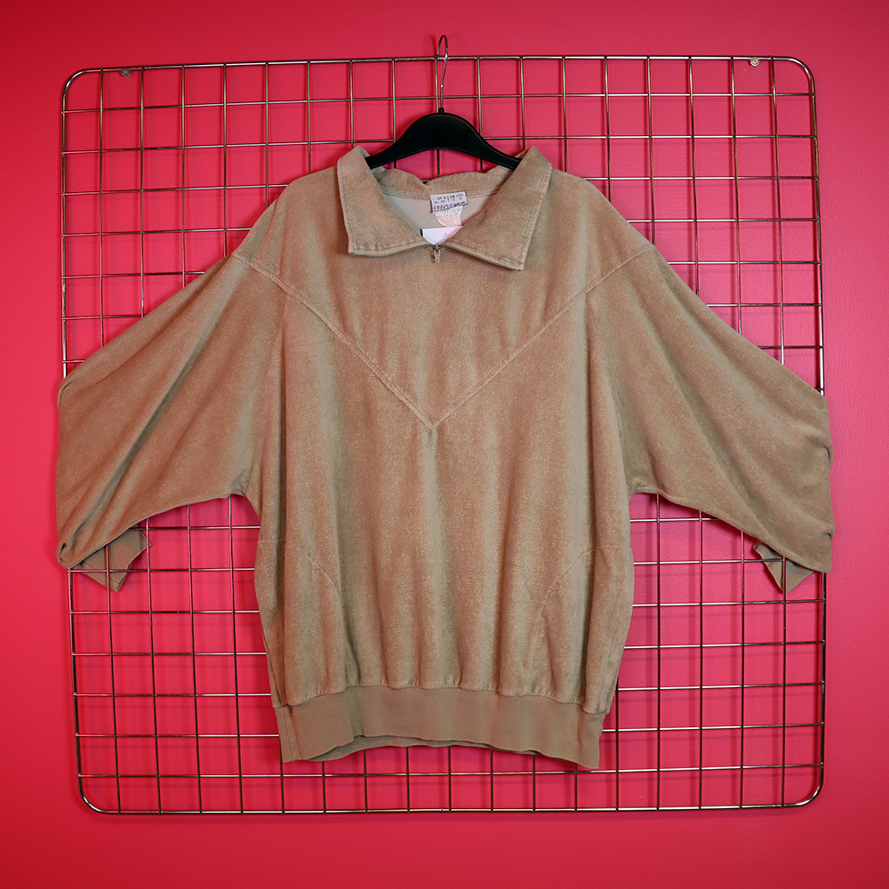 Kotimaisen Finnwear Oy:n Suomessa 80-luvulla valmistaja järkyttävän upea velour-paita. Sävynä hohtava vaalea beige. Hihansuissa ja helmassa trikooneulosta. Pääntiellä pystykaulus vetoketjukiinnityksellä. Sivutaskut. Pääntien vetoketju hieman jäykkä, muutoin ikäisekseen erittäin hyväkuntoinen, siisti ja näyttävä Finnwear Oy:n vintage-paita!