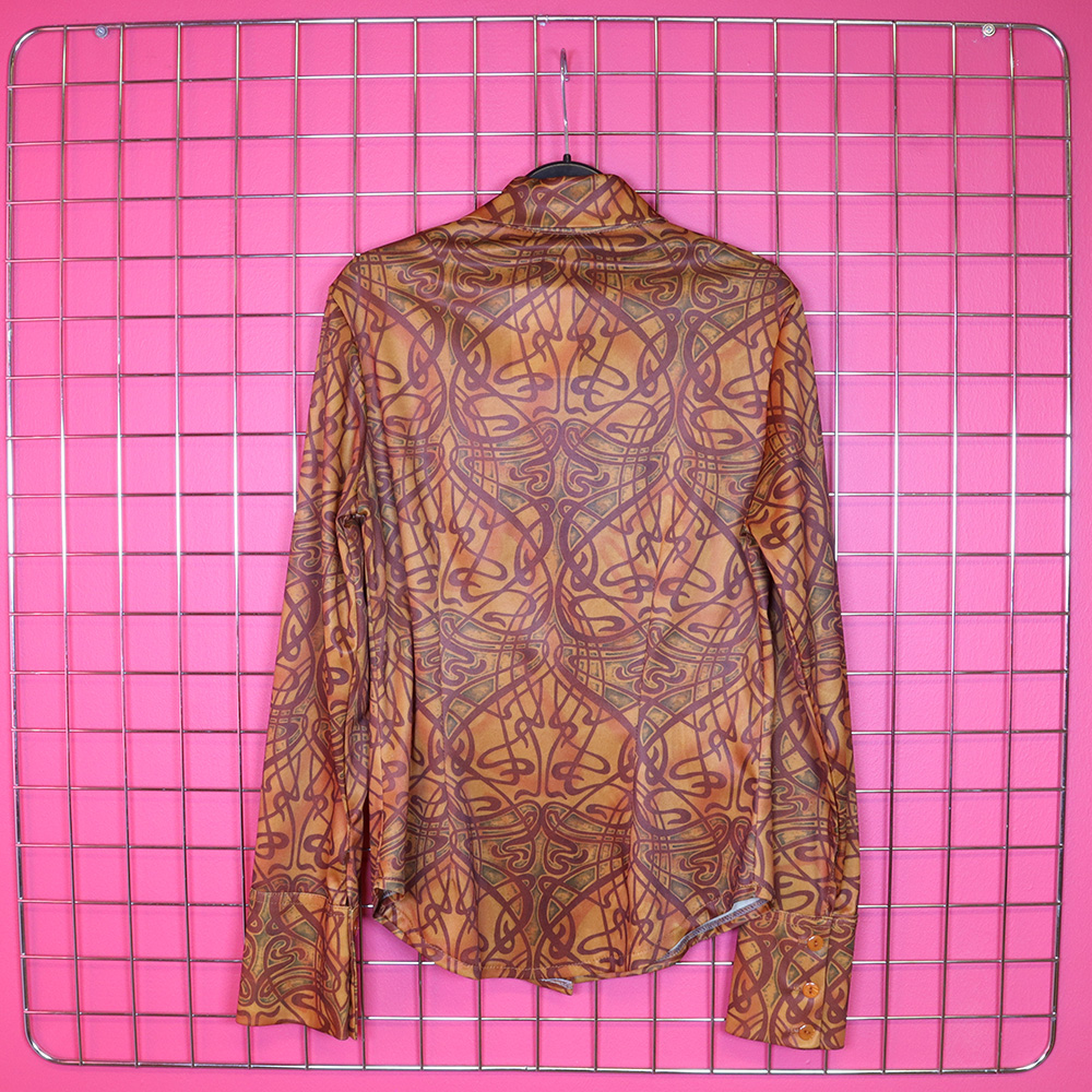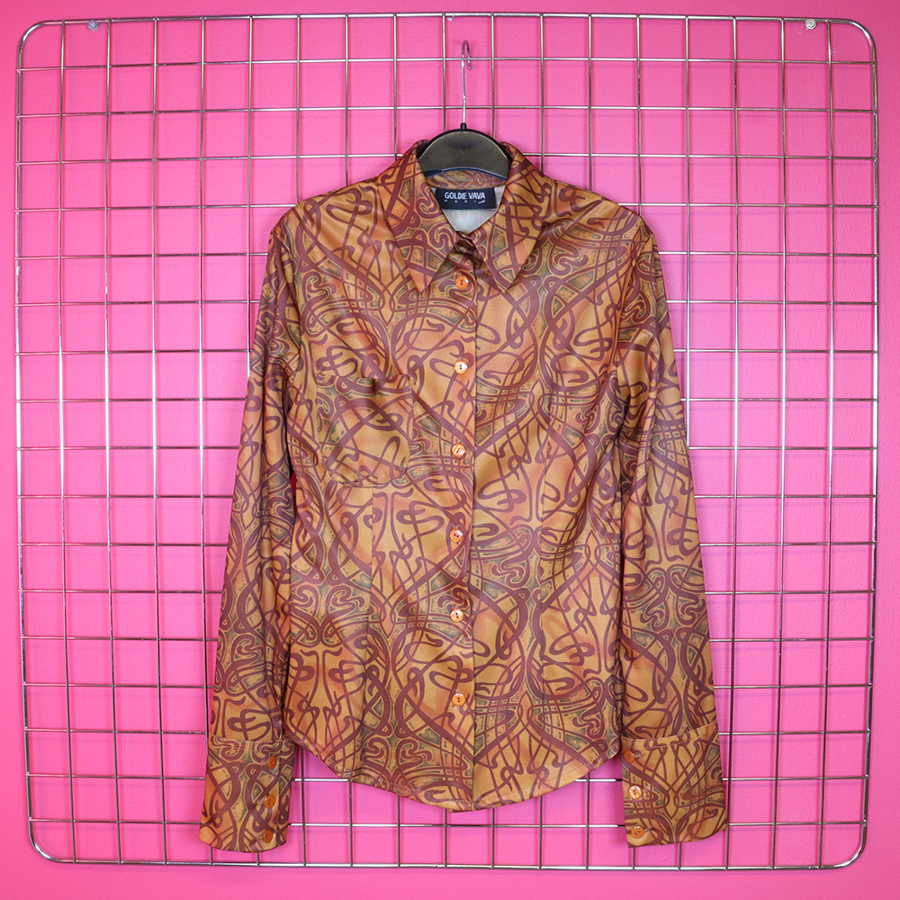 Godie Vava Paris -merkkinen 90-luvun lopussa / 00-luvun alussa valmistettu upea Y2K-paita. Materiaali-, valmistusmaa- ja kokotiedot kuluneet pois. Valmistettu kiiltäväpintaisesta trikookankaasta, jossa ruskeasävyinen näyttävä kuosi. Sisäänotettu paitamalli, jossa pieni kauluskäänne. Pyöristetty helma, rintatasku. Erittäin hyväkuntoinen ja näyttävä Y2K-paita ympärivuotiseen käyttöön!