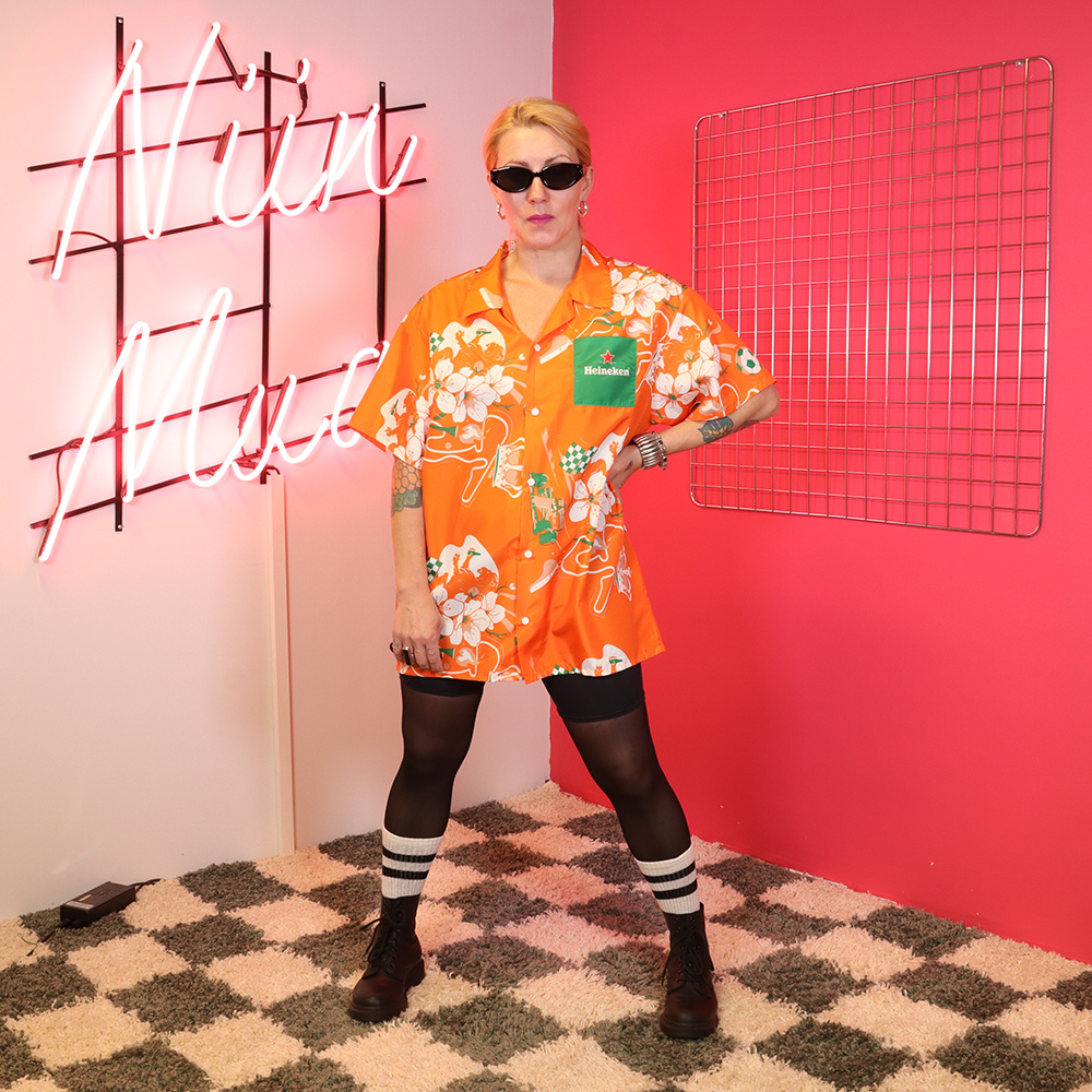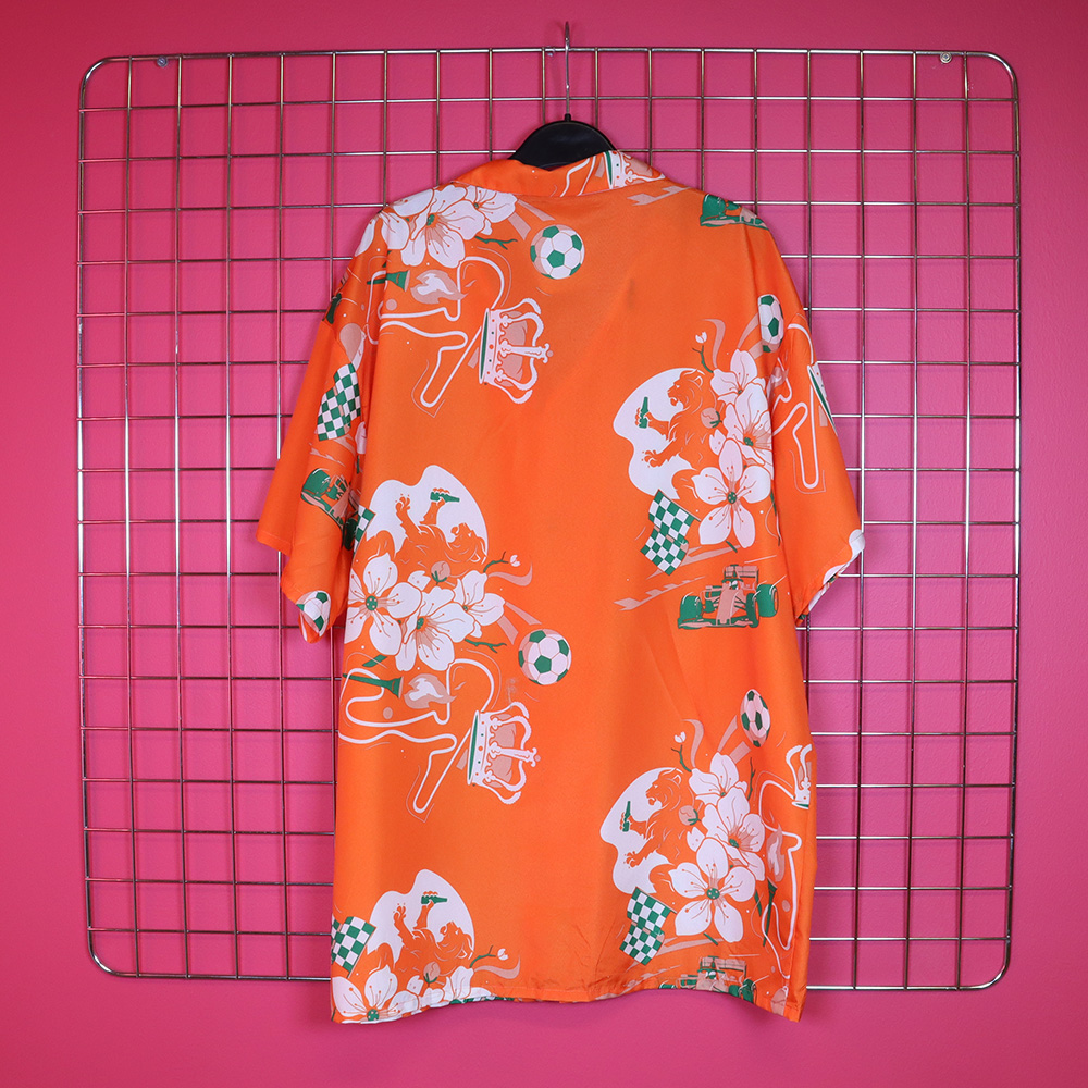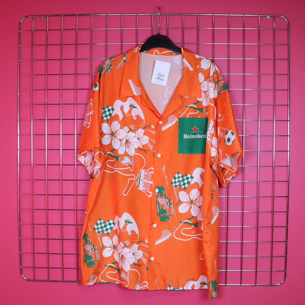 Havaijipaitahenkinen Heineken-paita 90-luvulta / 00-luvulta. Ei valmistusmaatietoja, tuotetiedot hollanniksi. Valmistettu helppohoitoisesta materiaalista, jossa oranssilla pohjalla trooppinen kukkakuosi, seassa myös ruutulippuja, jalkapalloja ja formula-autoja. Rento, lyhythihainen kauluspaitamalli, jossa vihreä rintatasku. Kiinnitys muovinapein. Erittäin hyväkuntoinen Heineken-paita itselle tai lahjaksi!