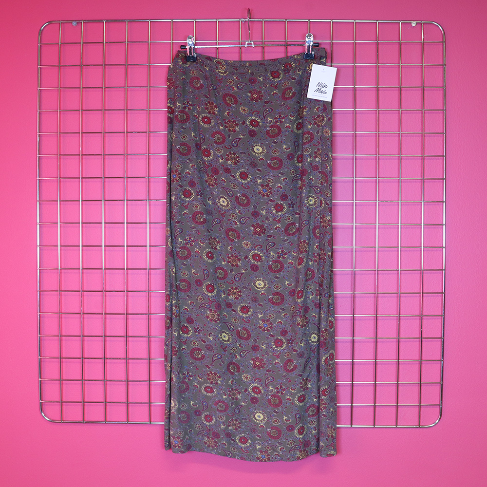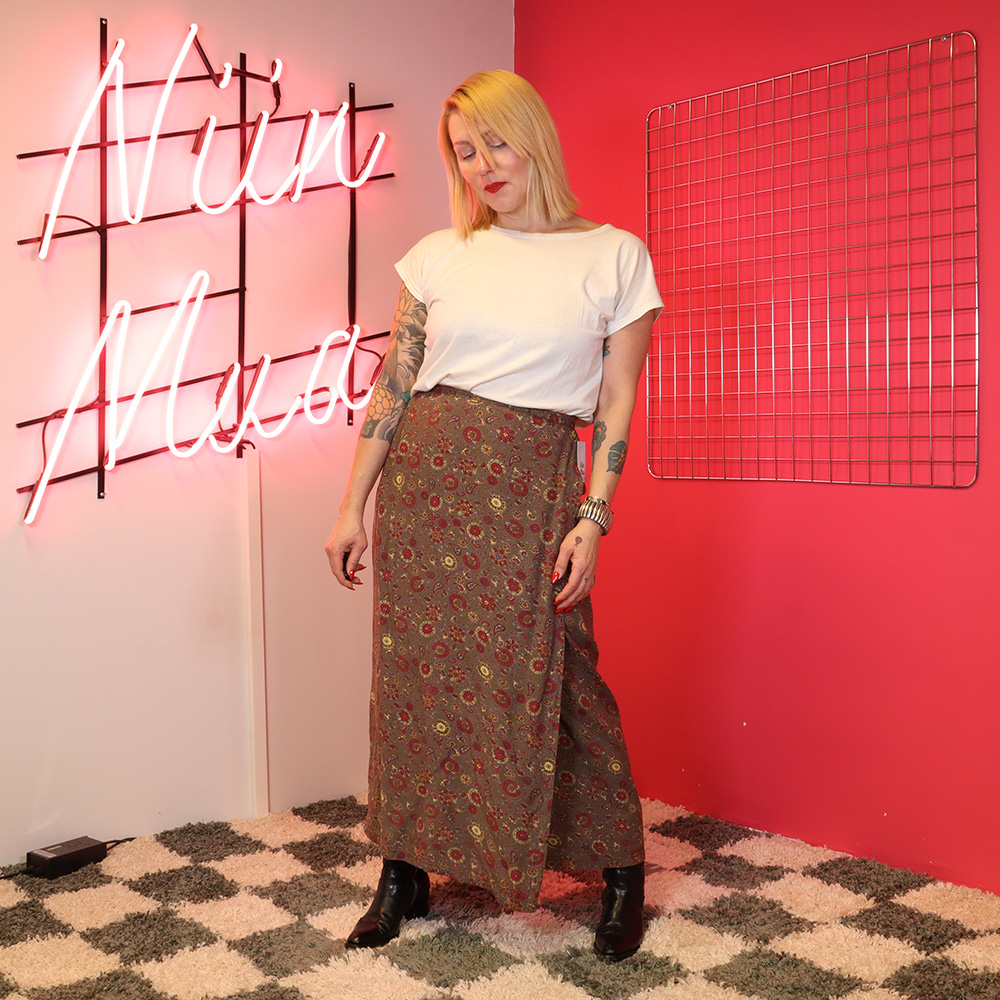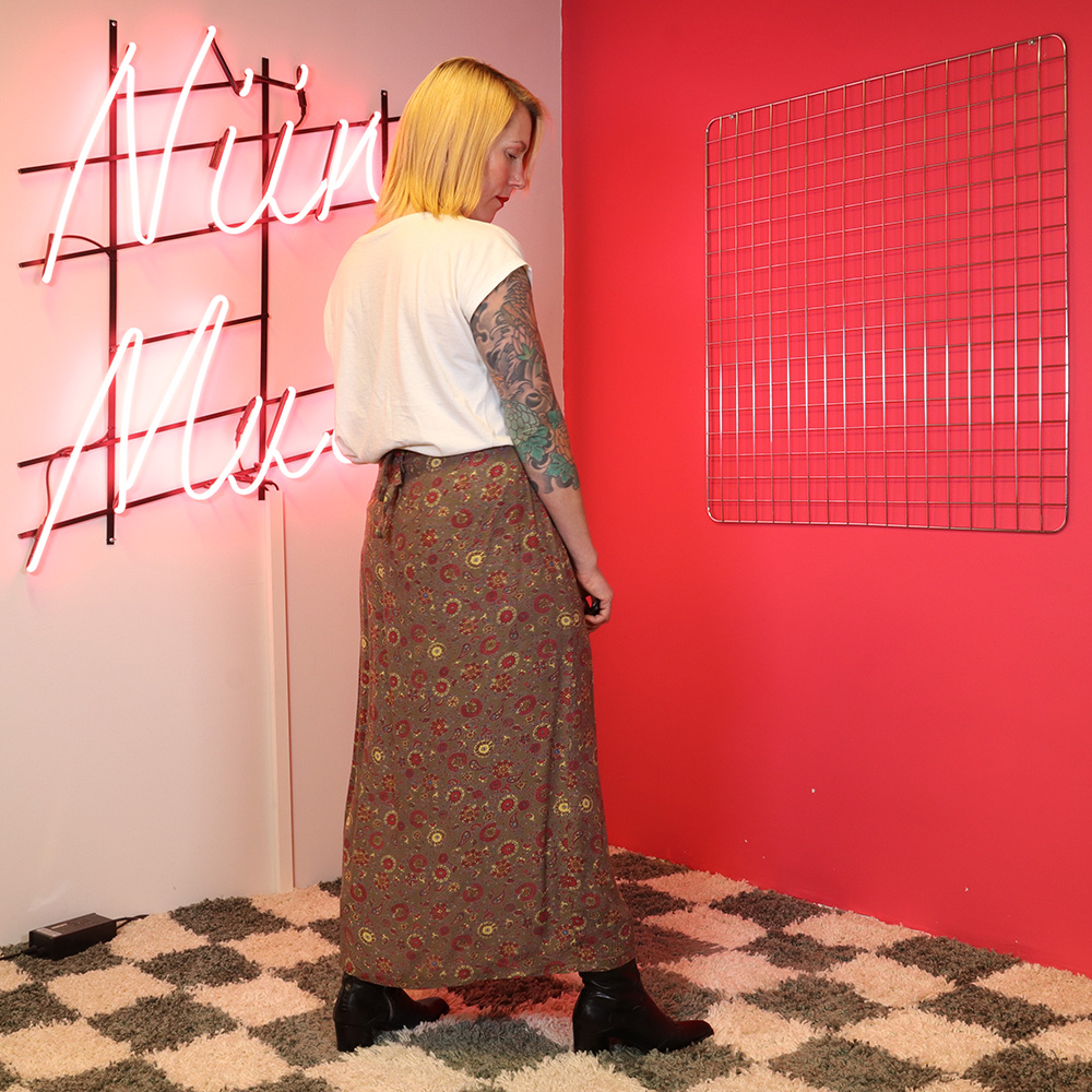 H&M:n Hennes Collection -tuotemerkille valmistama superkaunis kietaisuhame 90-luvulta. Valmistettu hengittävästä ja kauniisti laskeutuvasta viskoosikankaasta. Kankaassa khakinvihreällä pohjalla kaunis, pääosin punasävyinen kashmirkuosi. Muotolaskokset vyötäröllä ja kapea, solmittava nauha. Todella hyväkuntoinen ja näyttävä kietaisuhame festareille, kesäpäivään tai -juhlaan!