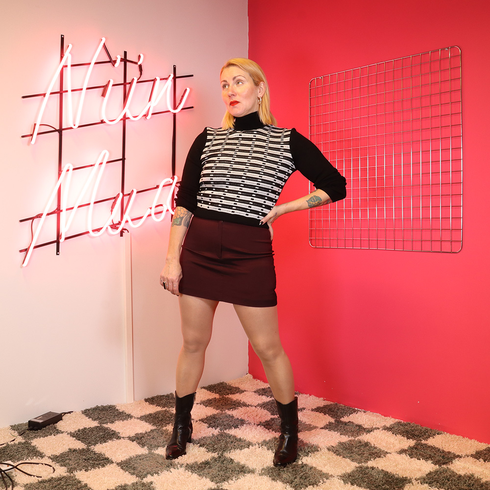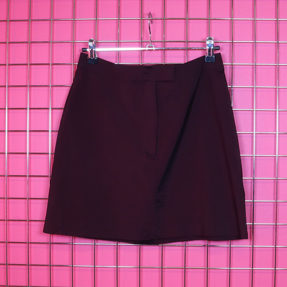 H&M:n Hennes Collection -tuotemerkille 90-luvulla valmistama huikea minihame. Ei valmistusmaatietoja. Valmistettu tummanpunaisesta, mustaan siftaavasta materiaalista, joka joustaa. Minimittainen. Vyötärökaitale Kiinnitys keskiedusta, vyötärökaitaleella piilonappi ja -hakanen. Ei vuorta. Erittäin hyväkuntoinen ja näyttävä minihame ympärivuotiseen käyttöön!