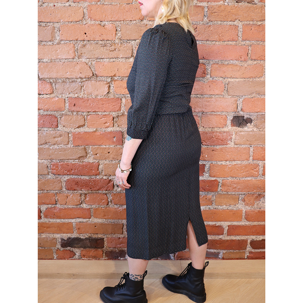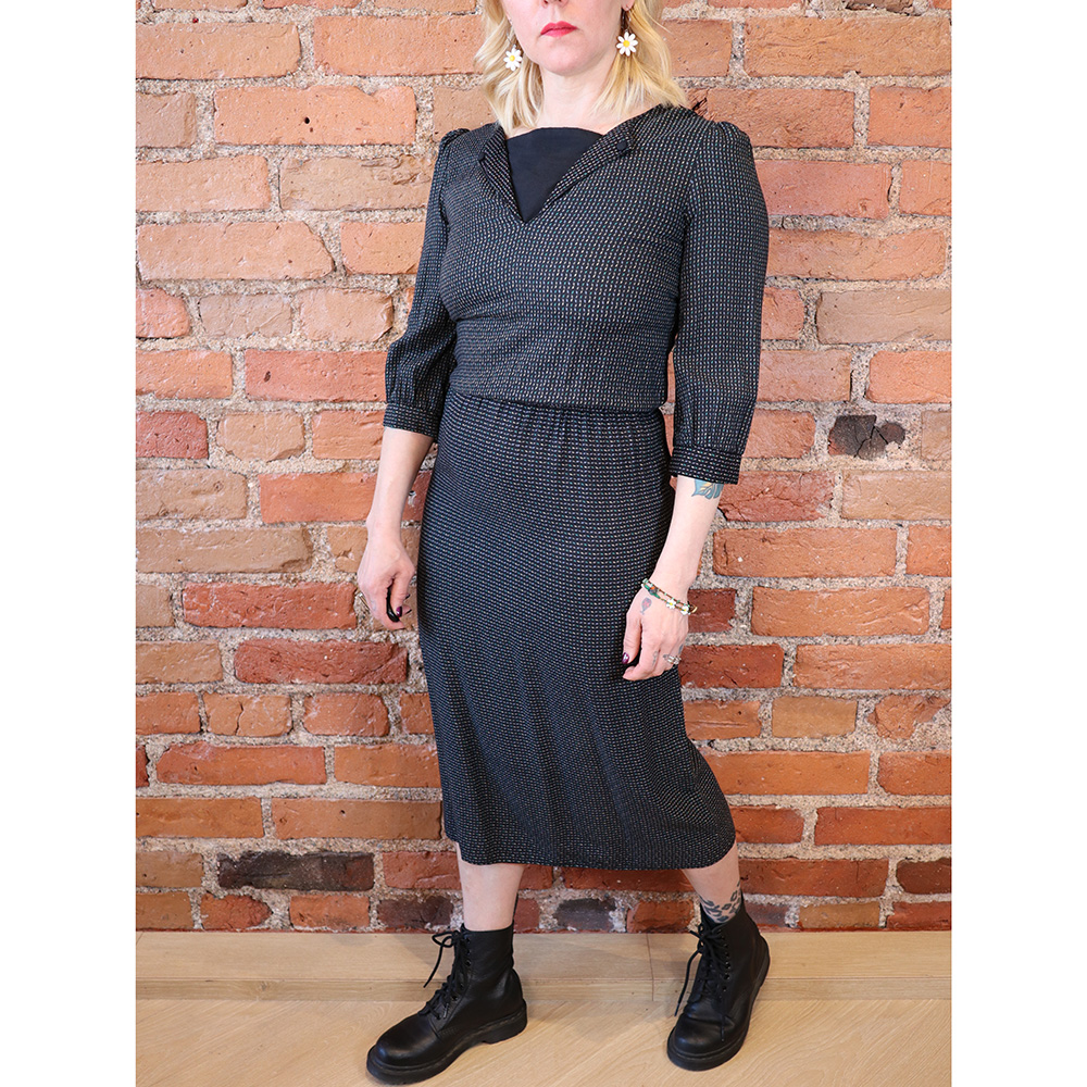 Kaunis ja hurmaava H&M:n Englannissa valmistama vintage-mekko 80-luvulta. Valmistettu sileästä, hengittävästä ja kauniisti laskeutuvasta viskoosista, jossa pieni salamakuosi. Pohjaväri musta. Kuosin sävyinä harmaa, siniharmaa ja sinivihreä. Kaksiosainen mekkomalli, jossa vajaamittainen, kevyesti pussitettu hiha. Kuminauhoitettu vyötärö. V-pääntie, jolla pienet käänteet ja päällystetyt koristenapit. Alla musta kappale luoden kulmikkaan pääntien. Nappihalkio niskassa. Olalla huomaamattomasti paikattu reikä, muutoin erittäin hyväkuntoinen ja hurmaava H&M:n vintage-mekko arkeen tai juhlaan!
