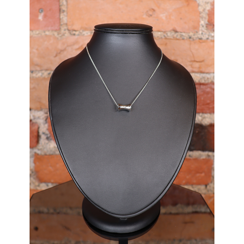 Todella kaunis ja moderni, käyttämätön 90-luvun kaulakoru. Koru on ostettu valikoimaan vanhan korukaupan jäämistöstä, joten se on täysin käyttämätön. Valmistettu hopeanvärisestä korumetallista. Lyhyehkö ketju, jossa lukkokiinnitys. Ketjuun pujotettu sylinterinmuotoinen riipus. Käyttämätön ja kaunis 90-luvun kaulakoru arkeen tai juhlaan!