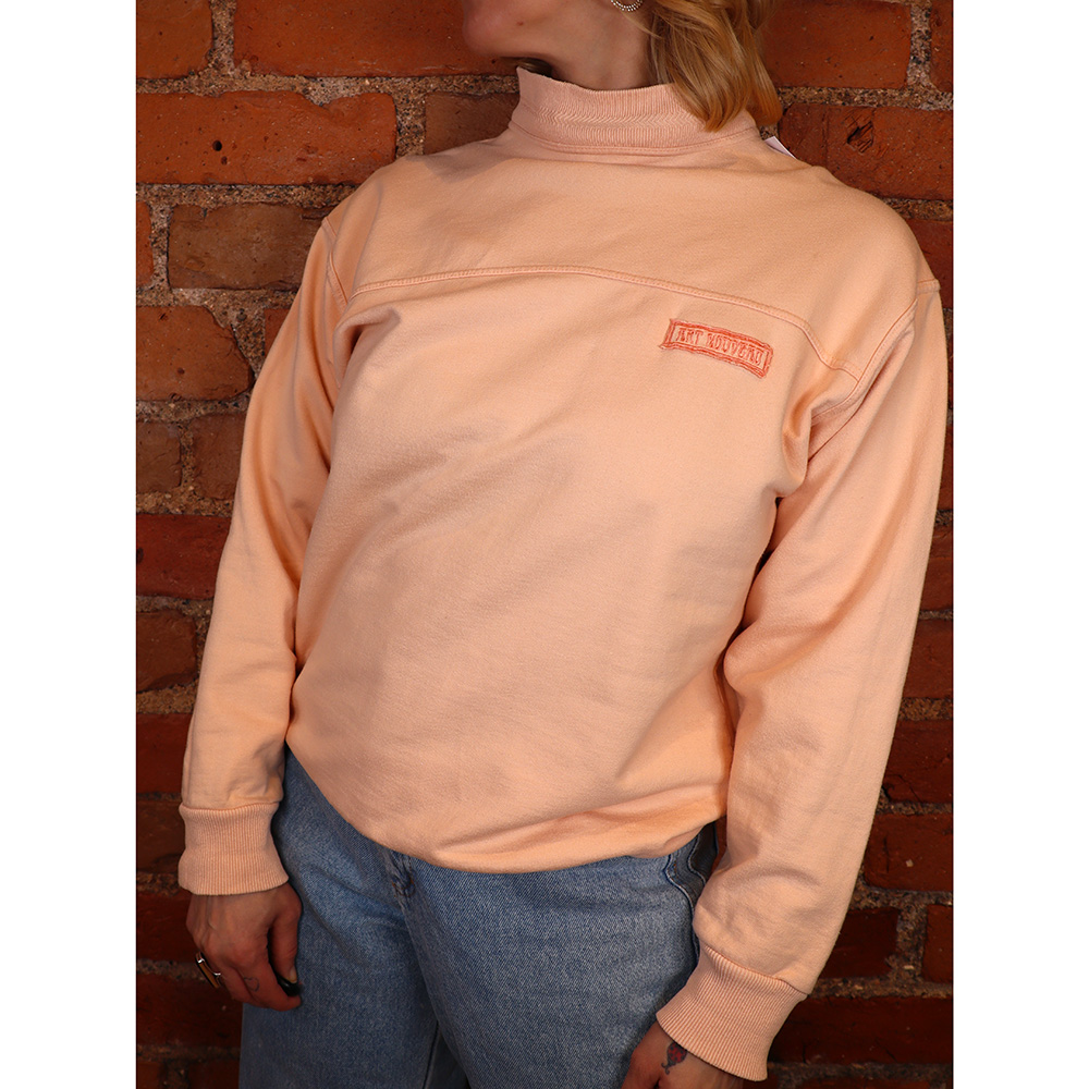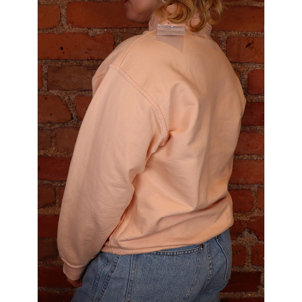 Hurmaava Hot Zone -merkkinen persikanvärinen swetari 80/90-luvulta. Valmistettu Kreikassa. Valmistettu vahvasta puuvillatrikoosta, jonka sävynä raikas persikka. Ihana, lyhyehkö malli, jossa korkea kaulus. Hihansuut ja helma joustinneulosta. Rinnalla muotosauma ja pieni Art Noveau -brodeeraus. Toisella olalla muutama tummempi värjäymä, muutoin lähde uudenveroinen ja herkullinen persikanvärinen swetari arkeen ja jumppaan! HUOM! Swetarin kaulus hyvin kireä – ei sovi yli 56 cm kokoisen pään yli.
