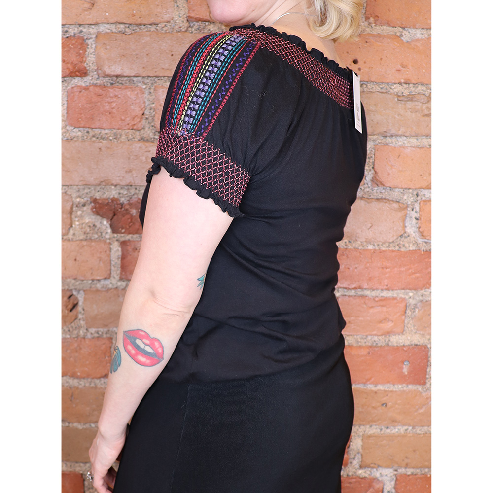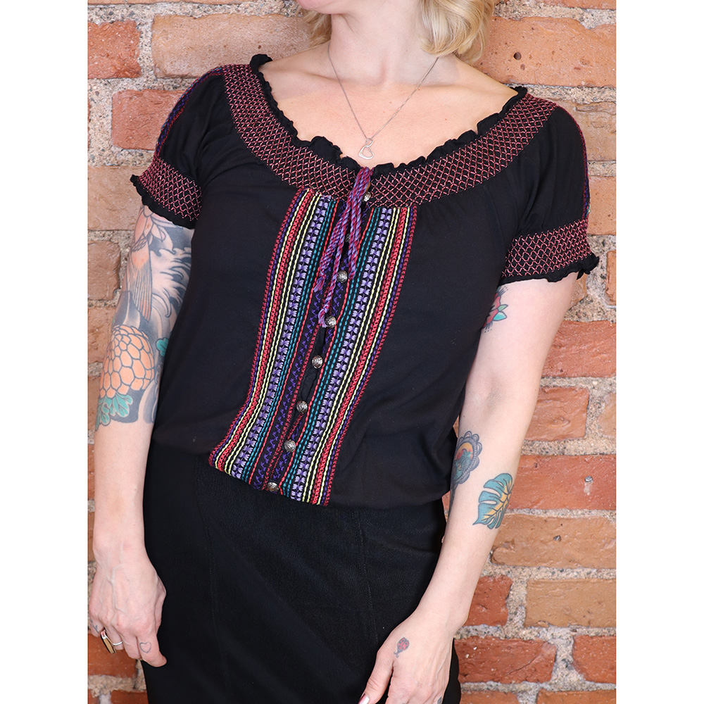 Indiska Oy:n 00-luvulla Intiassa valmistama ajataon bohohenkinen pusero. Valmistettu hengittävästä ja kevyestä, mustasta puuvilla-modaalitrikoosta. Helmassa, hihansuilla, pääntiellä, miehustassa ja olan ulkosyrjällä värikäs kirjailu. Pääntien, hihansuiden ja helman kirjailu kuminauhoitettu; pusero joustaa – pääntien voi tiputtaa olalta olkavarrelle. Pussimainen malli, jossa pussitettu lyhyt raglan-hiha. Keskiedessä nappikiinnitys, pääntiellä solmittava nyöri. Erittäin hyväkuntoinen, suloinen ja ajaton bohohenkinen pusero kesäpäivään ja -festareille!