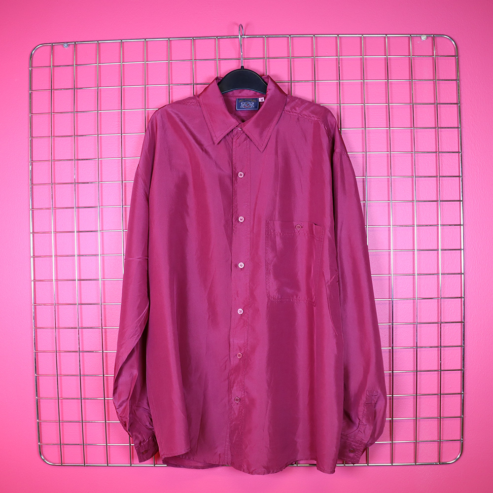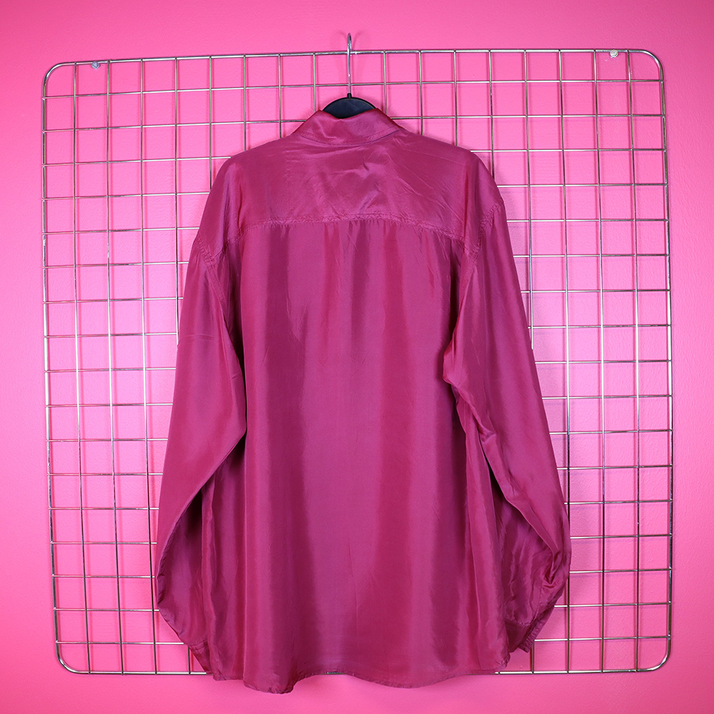 Vaatehuone Oy:n Jan Stuart- tuotemerkille valmistuttama silkkipaita 90-luvulta. Valmistettu Kiinassa. Valmistettu kauniisti laskeutuvasta, hengittävästä ja kevyesti hohtavasta silkkikankaasta, jonka värinä purppuran punainen. Ajaton kauluspaitamalli, jossa kauluskäänteet ja iso, nappillinen rintatasku. Kiinnitys keskiedusta muovinapeilla. Pyöristetty helma. Takakappaleen sivulla 2 x 3 cm rasvatahra (huomioitu hinnassa), muutoin hyväkuntoinen silkkipaita myös unisex-käyttöön!