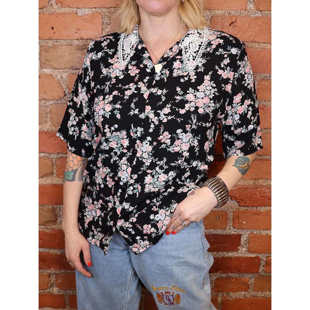 Kaunis ja hurmaava, Jardin-merkkinen kukkapusero pitsikauluksella. Muotokielen perusteella valmistettu 1990-luvulla. Ei valmistusmaatietoa. Valmistettu hengittävästä ja kauniisti laskeutuvasta viskoosista, jossa mustalla pohjalla pienikokoinen kukkakuosi. Kuosin pääväreinä valkoinen, vaaleanpunainen, vaaleanvihreä ja vaaleansininen. Ihana, hieman tyköistuva malli, jossa istutettu hiha. Pääntiellä näyttävä ja kaunis pitsikaulus. Kiinnitys keskiedusta napeilla. Erittäin hyväkuntoinen ja kaunis kukkapusero pitsikauluksella arki- ja juhlakäyttöön!