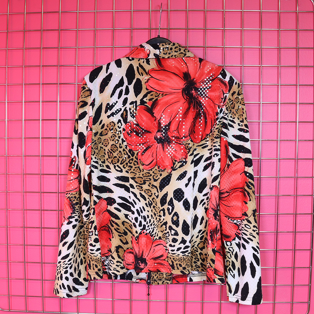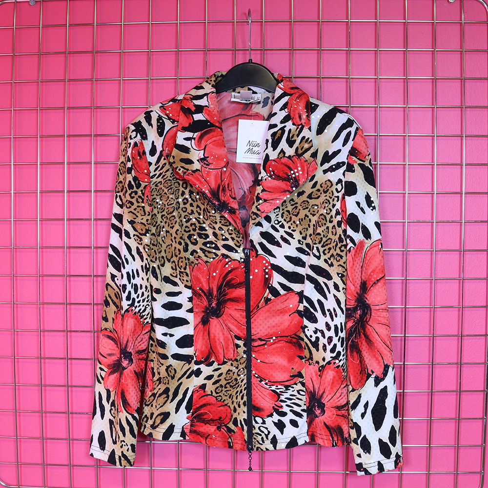 Järkyttävän upea, Josepf Ribkoff -merkkinen paitajakku 90-luvulta. Valmistettu Kanadassa. Valmistettu joustavasta trikookankaasta, jossa suurikokoisen, punaisen kukkakuosin lisäksi eläinkuosia. Kankaan pinnassa kiiltäviä paljetteja – more is more. Paitajakkumalli, jossa laakea kauluskäänne ja edessä vetoketjukiinnitys. Sisäänotettu malli, hyvin kevyet olkatoppaukset. Vetoketjun hyvin pientä kulumaa lukuunottamatta uudenveroinen ja näyttävä, laadukas Josepf Ribkoff -paitajakku tilaisuuteen kuin tilaisuuteen!