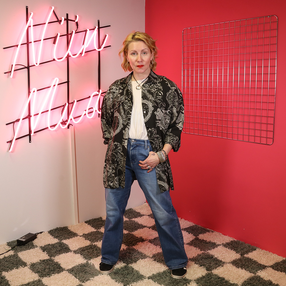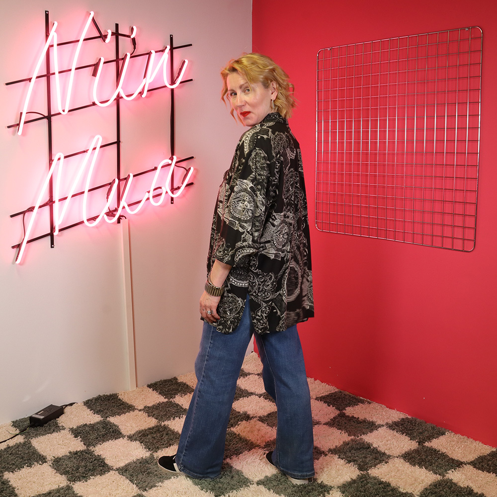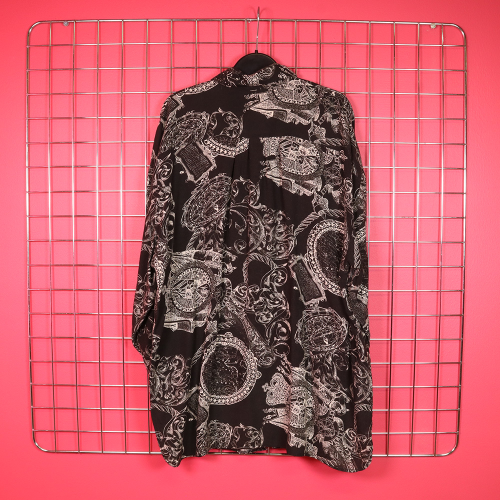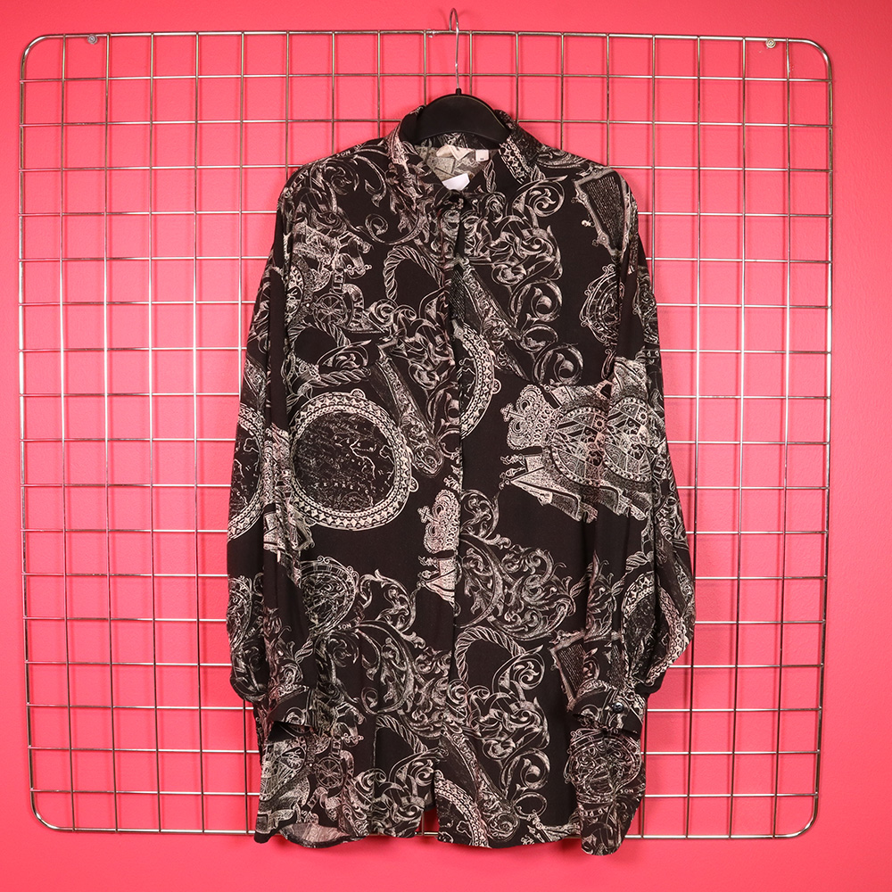 Vaatehuone Oy:n Just In -tuotemerkille 90-luvun alussa Portugalissa valmistama musta viskoosipaita. Valmistettu kauniisti laskeutuvasta ja hengittävästä viskoosikankaasta, jossa mustalla pohjalla valkoinen, graafinen kuosi. Rento kauluspaitamalli, jossa kauluskäänne. Rinnalla valetaskuläpät. Pyöristetty helma. Tiputettu olkalinja, vajaamittainen hiha. Sivusaumat helmasta korjattu, muutoin hyväkuntoinen ja monikäyttöinen musta viskoosipaita myös unisex-käyttöön!