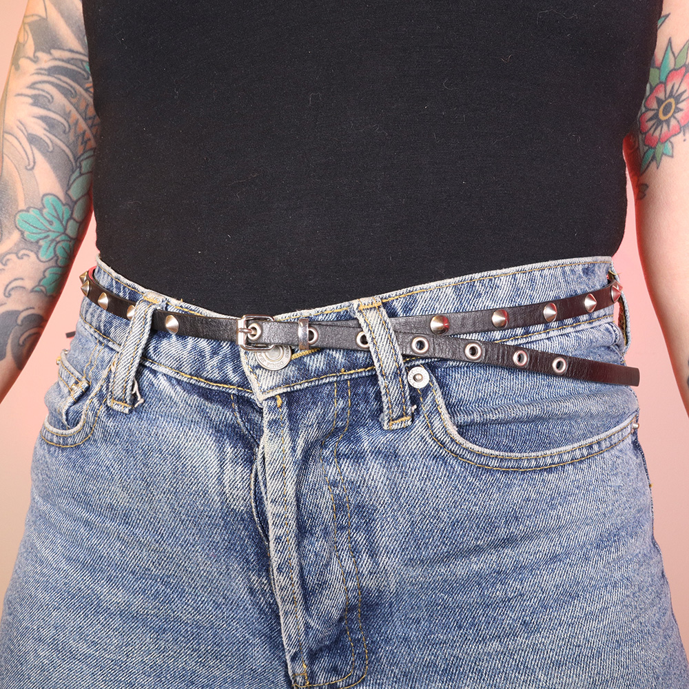 Merkitön kapea niittyvyö ehkäpä 90-luvulta. Valmistettu mustasta nahasta. Lähes koko matkalla pyöreitä niittejä. Pienikokoinen, hopeanvärinen solki. Uudenveroinen, ajaton musta niittyvyö!