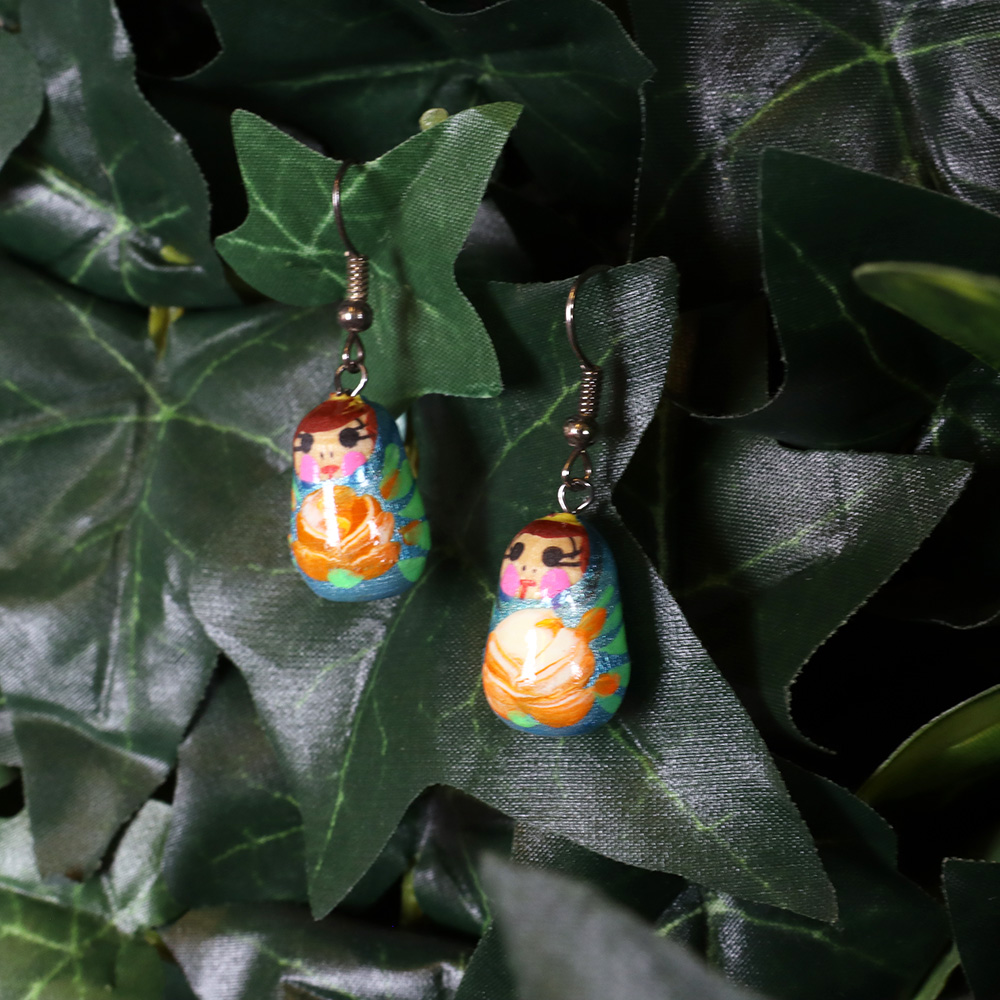 Ihastuttavat, käsin valmistetut ja maalatut maatuskakorvakorut. Hopeinen koukkukiinnitys. Riipus maatuskan muotoinen, sävyinä turkoosi, vihreä ja oranssi. Hyväkuntoiset ja hurmaavat maatuskakorvakorut arkeen tai juhlaan!