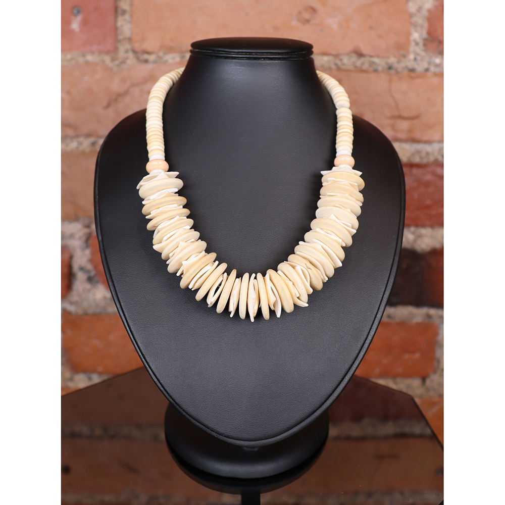 Kaunis ja näyttävä, käyttämätön iso kaulakoru 90-luvulta. Koru on ostettu valikoimaan vanhan korukaupan jäämistöstä, joten se on täysin käyttämätön. Valmistettu pääosin litteistä puuhelmistä. Edessä isompien puuhelmien välissä helmiäispaloja. Koru pitää hauskaa ääntä. Kiinnitys niskasta messinkisellä ruuvilukolla. Uudenveroinen ja kaunis, iso kaulakoru arkeen tai juhlaan!