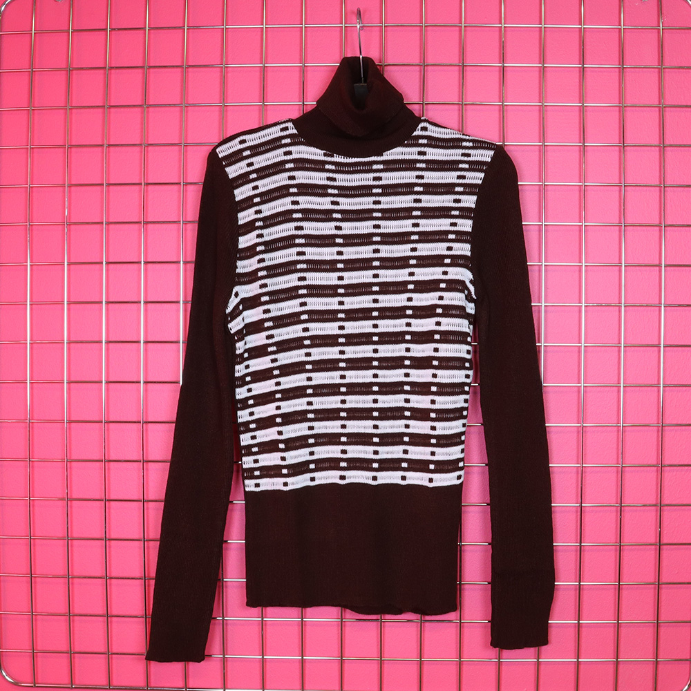 Huikea aikakautensa vintage-poolopaita 70-luvulta. Poolo on ostettu vanhan vaatekaupan jäämistöstä, joten se on täysin käyttämätön. Poolo pääosin ruskea, etukappaleella ruskea-valkoista raitamaista kuvioneulosta. Kuvioneulos korostaa kauniisti vyötärölinjaa. Ajaton malli, jossa poolokaulus. Käyttämätön vintage-poolopaita ympärivuotiseen käyttöön!