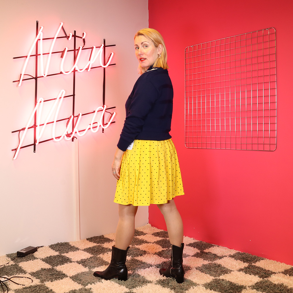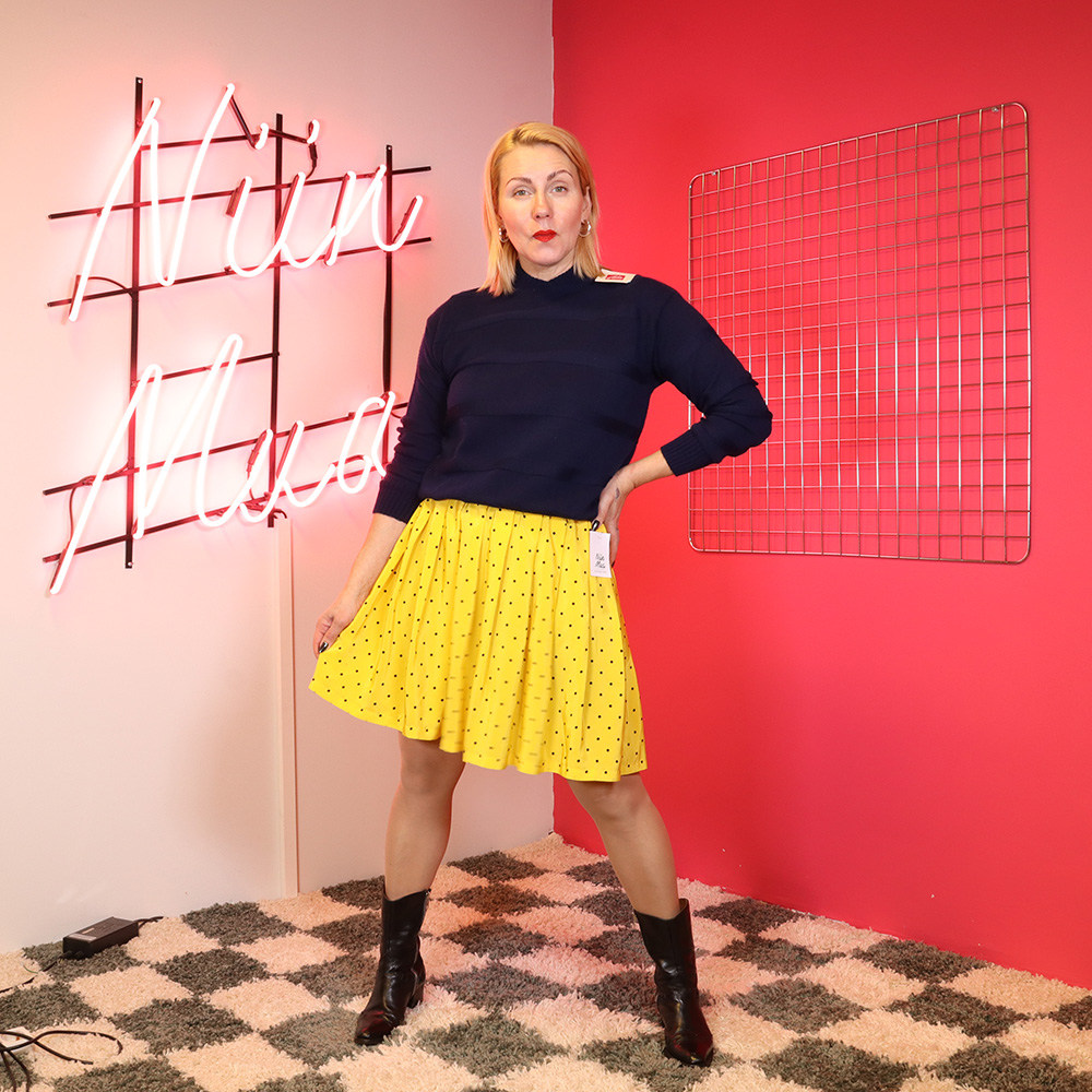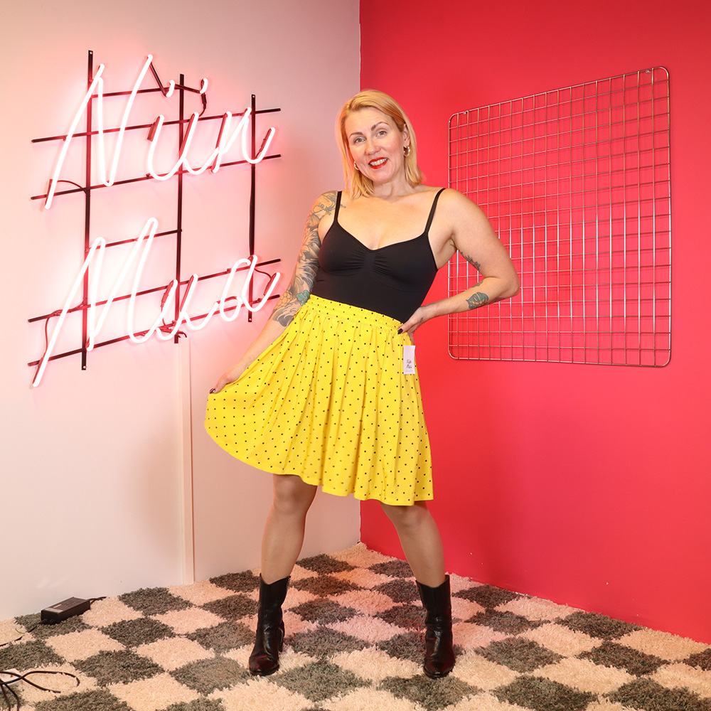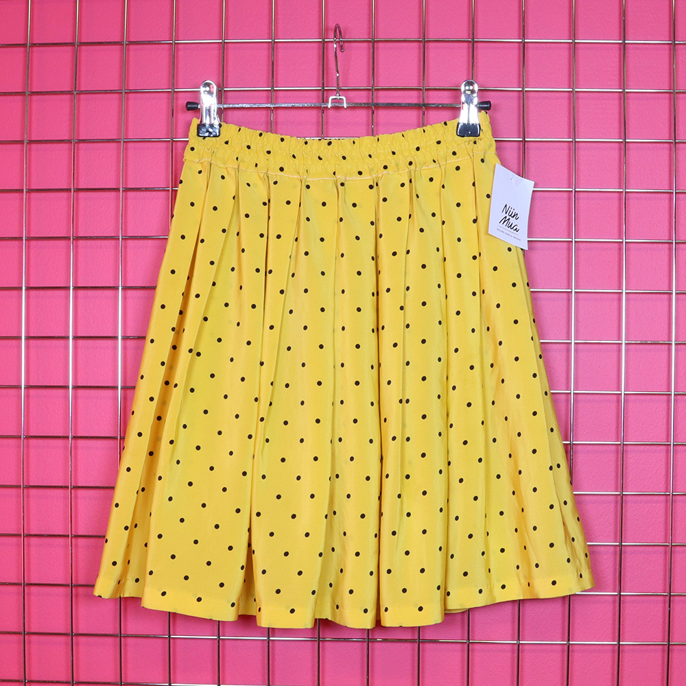 Hurmaava keltainen polka dot -hame todennäköisesti 90-luvulta. Valmistettu kauniisti lakeutuvasta keltaisesta kankaasta, jossa pieni musta polka dot -kuosi. Lyhyt laskoshamemalli. Vyötärökaitale kokonaan kuminauhoitettu. Hame on hieman kömpelösti lyhennetty vyötärökaitaleelle (huomioitu hinnassa), muutoin erittäin hyväkuntoinen keltainen hame kesäpäivään!
