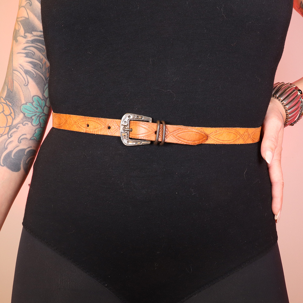Näyttävä ja kaunis, konjakainvärinen nahkavyö 70-luvulta. Valmistettu konjakinvärisestä nahasta, jossa painokuvio. Näyttävä pieni solki. Luonnollista patinaa, mutta ikäisekseen todella hyväkuntoinen konjakinvärinen nahkavyö.