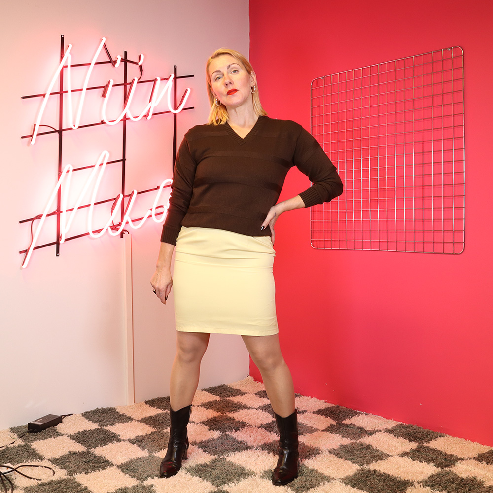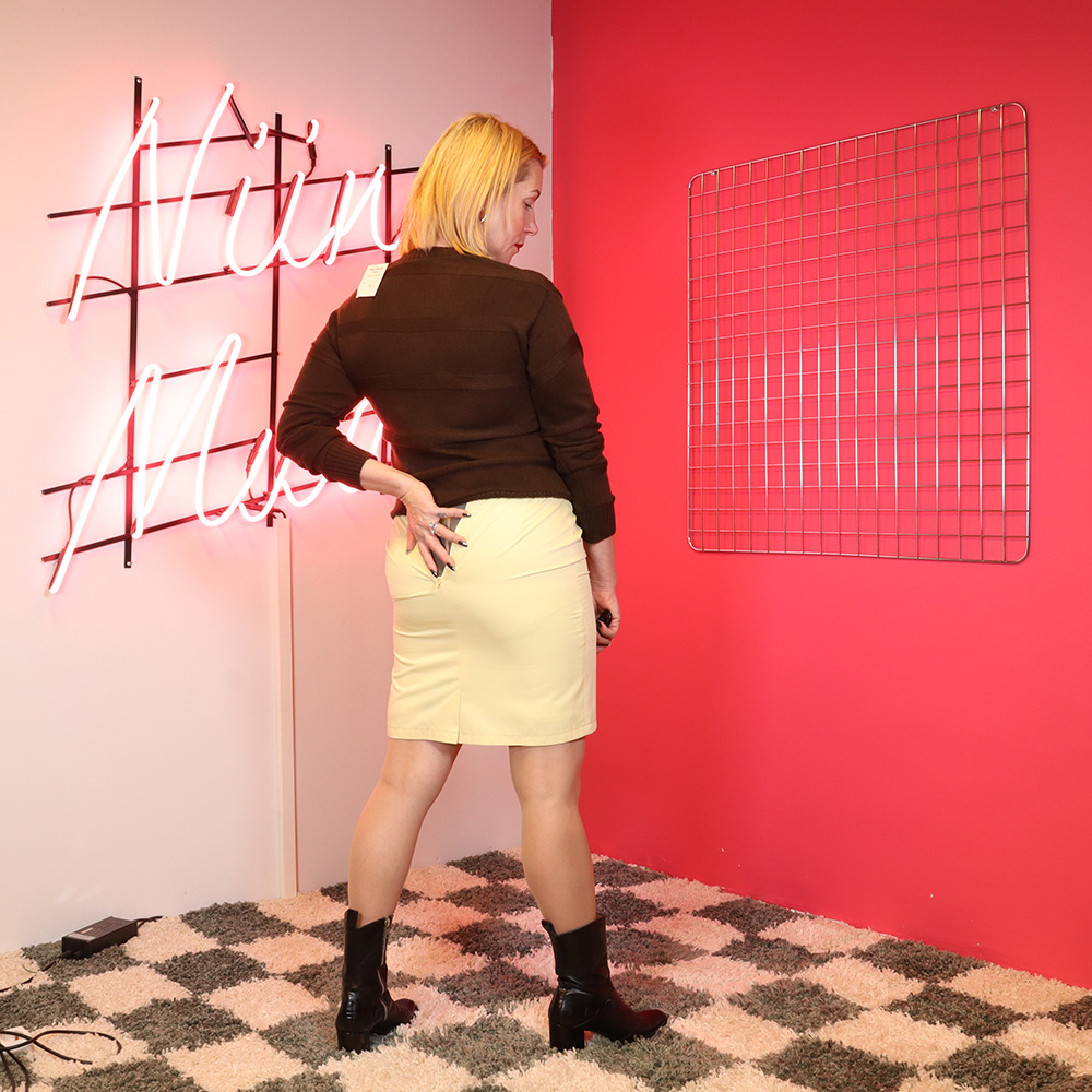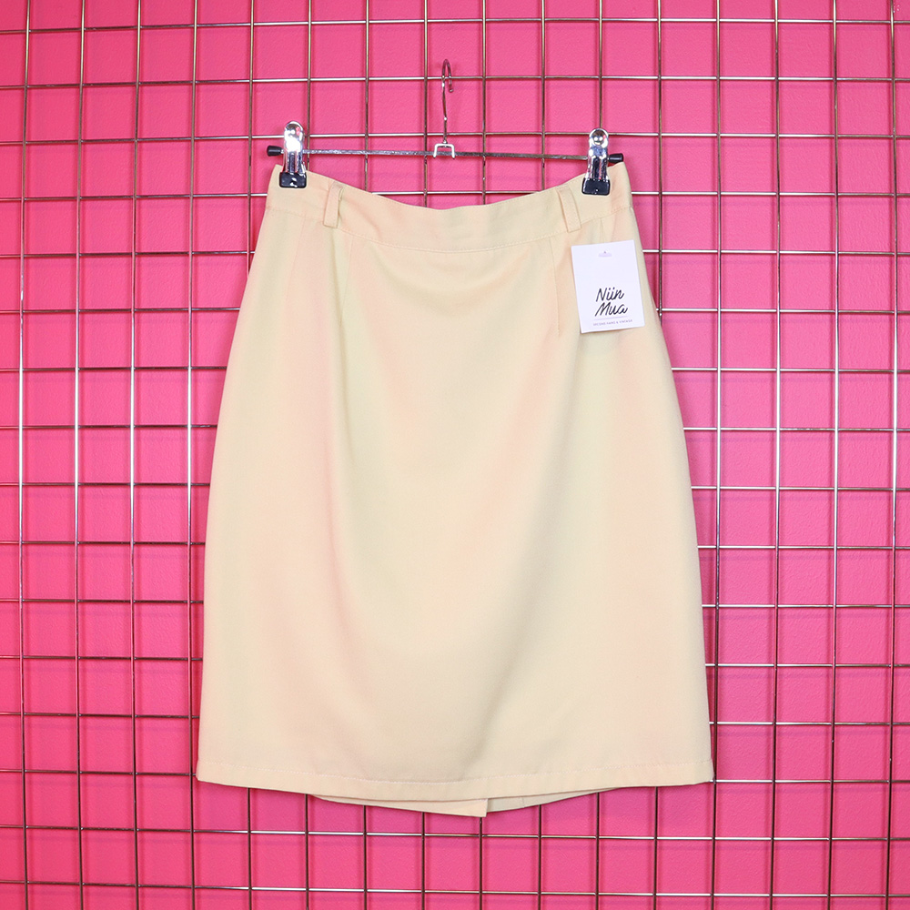 Ihana & ajaton, Suomessa 90-luvulla valmistettu lyhyt kynähame. Ei valmistajatietoja, vain tuotetiedot ja valmistusmaa. Valmistettu viskoosisekoitekankaasta, jonka sävynä vaaleankeltainen. Ihana, kapeahko kynähamemalli, jossa keskitakasaumassa pieni halkio. Vyötärökaitale, jolla vyölenkit. Kiinnitys keskitakasaumasta vetoketjulla ja napilla. Kokonaan vuoritettu. Vuori saumasta kevyesti repeytynyt, muutoin erittäin hyväkuntoinen ja ajaton kynähame ympärivuotiseen käyttöön!