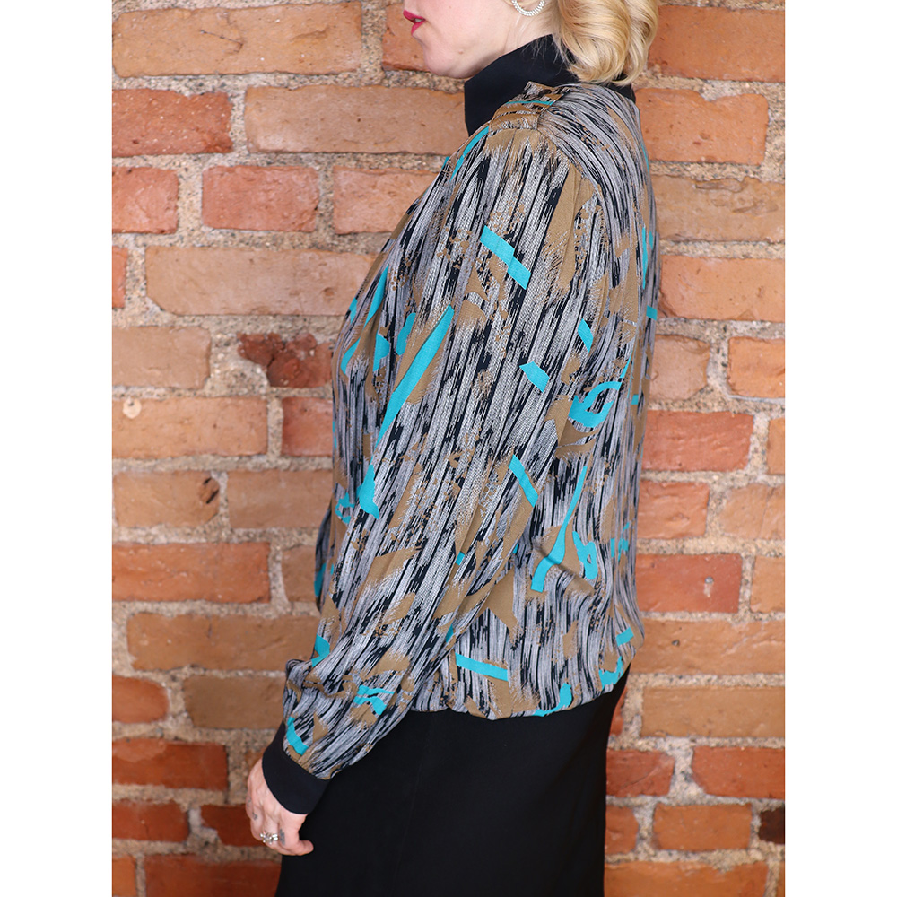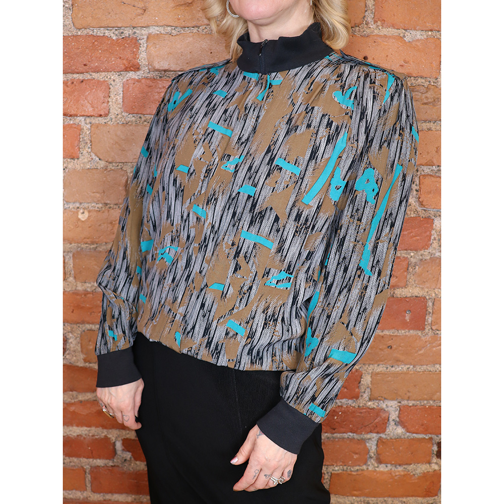 Kurt Kellermann -merkkinen hurmaava viskoosipusero 90-luvulta. Muotokielen ja materiaalin perusteella todennäköisesti 1990-luvulla valmistettu. Valmistettu Kreikassa. Valmistettu hengittävästä ja laskeutuvasta viskoosikankaasta, jossa mustalla pohjalla graafinen kuosi. Kuosin pääsävyinä valkoinen, beige ja turkoosi. Puseromallinen, jossa helmassa, hihansuissa ja pääntiellä joustinneulosta. Pääntieltä vetoketjukiinnitys rinnan korkeudelle. Olalla koristeelliset epoletit. Kaulusta voi pitää pystyssä tai laakana. Joustinneulososilla pientä nukkaa, muutoin hyväkuntoinen ja hengittävä viskoosipusero ympärivuotiseen käyttöön!