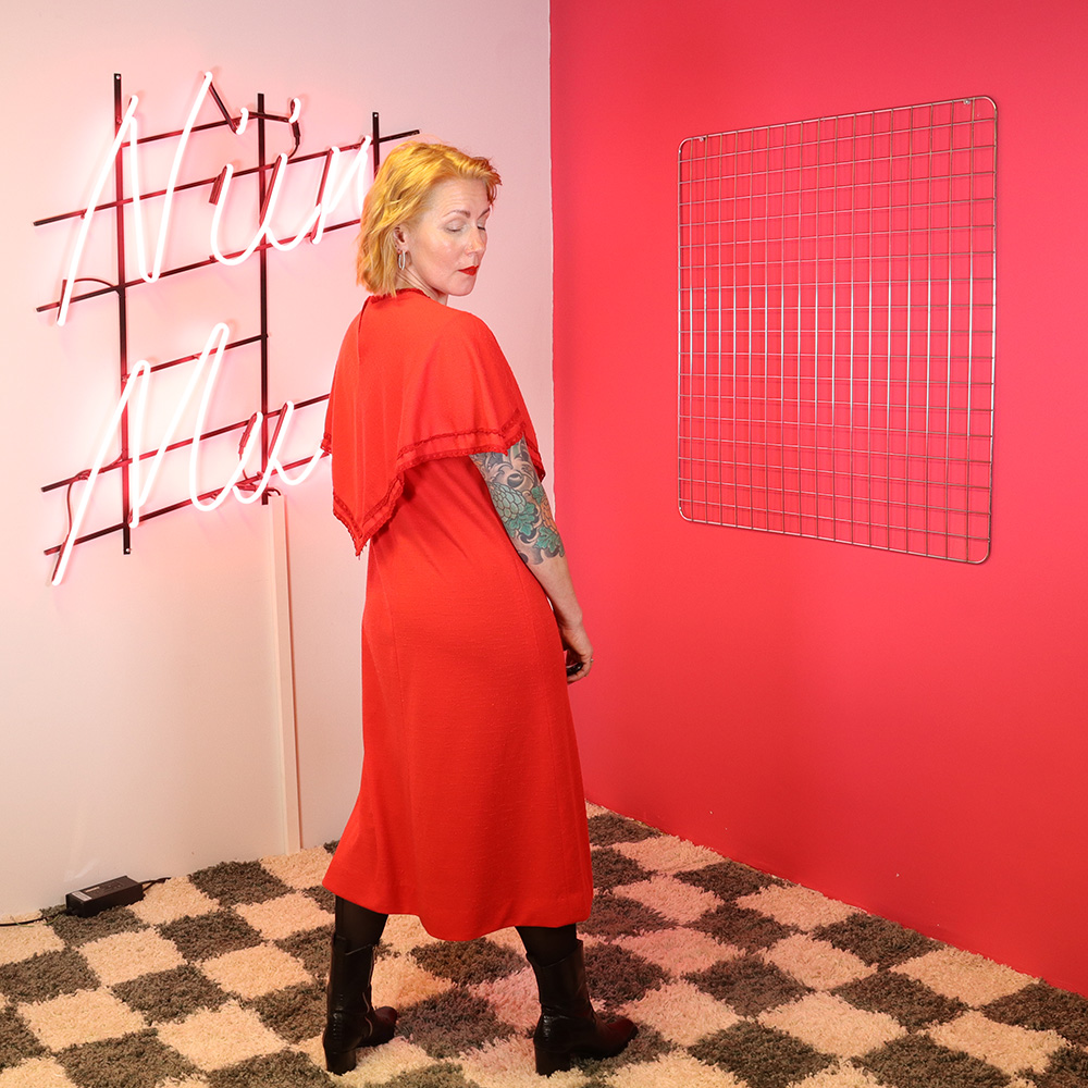 L-Kolttu Oy:n Suomen Myrskylässä 70-luvulla valmistama herkkä, punainen leninki. Valmistettu helppohoitoisesta, keskipunaisesta kankaasta. Aikakautensa hieman A-linjainen malli, jossa pääntiellä näyttävä laakakaulus. Pääntiellä ja kauluksen reunalla pitsiyksityiskohta. Kiinnitys niskasta vetoketjulla. Erittäin hyväkuntoinen ja kaunis punainen leninki varsinkin joulukauteen!