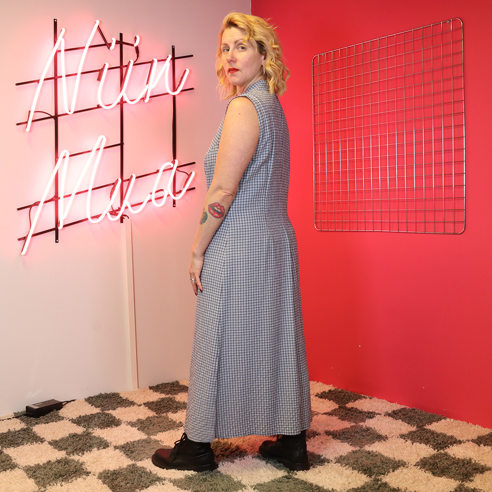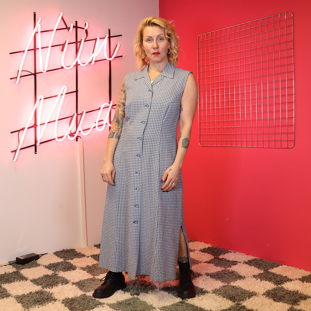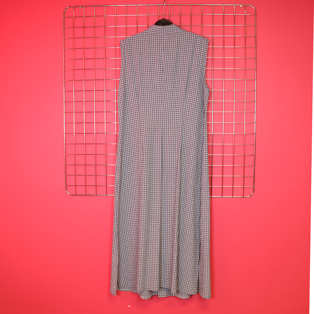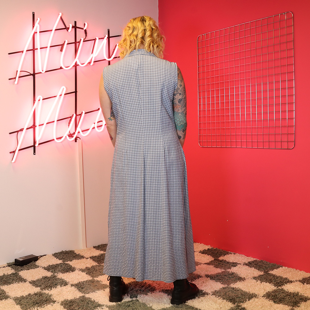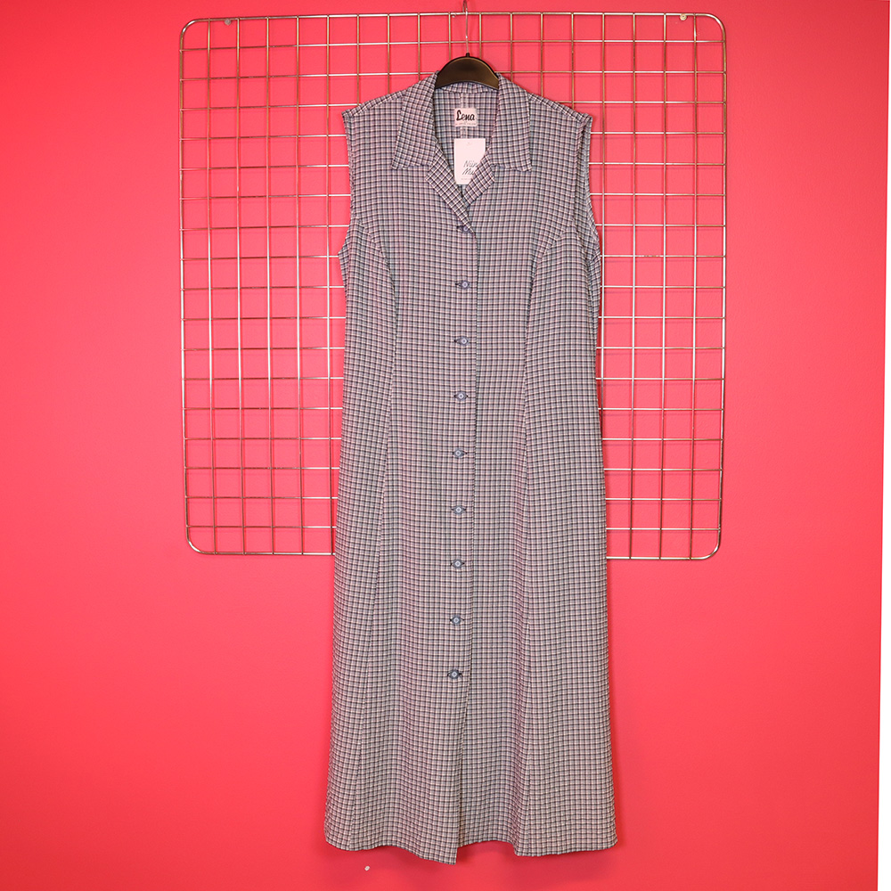 Ermiso Ky:n Lena-tuotemerkille 90-luvulla valmistama upea kotimainen kesämekko. Valmistettu Lahdessa. Valmistettuhengittävästä, mutta helppohoitoisesta viskoosisekoitekankaasta, jossa pieni, sinisävyinen ruutukuosi. Materiaali krepattu. Hihaton, täyspitkä liivimekkomalli, jossa pieni herrainkaulus – voidaan käyttää myös auki. Helmassa kauniit halkiot. Kiinnitys keskiedusta napeilla. Uudenveroinen kotimainen kesämekko arkeen, juhlaan ja festareille!