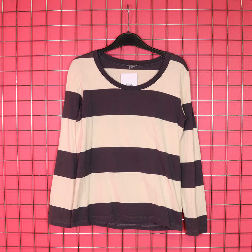 Laadukas ja ajaton, Marimekko by Mika Piirainen -trikoopaita 90-luvulta. Valmistettu Virossa, joten paita on todennäköisesti vastuullisesti valmistettu. Valmistettu sileästä, hengittävästä ja helppohoitoisesta puuvillatrikoosta, jossa leveä vaakaraitakuosi. Kuosin sävyinä tummanharmaa ja todella vaalea beige. Vartaloa myötäilevä paitamalli, jossa pyöreä pääntie ja pitkä hiha. Pinta käsitelty nukkaleikkurilla ja sivusauman minimaalinen reikä paikattu. Muutoin erittäin hyväkuntoinen ja ajaton trikoopaita 90-luvulta!