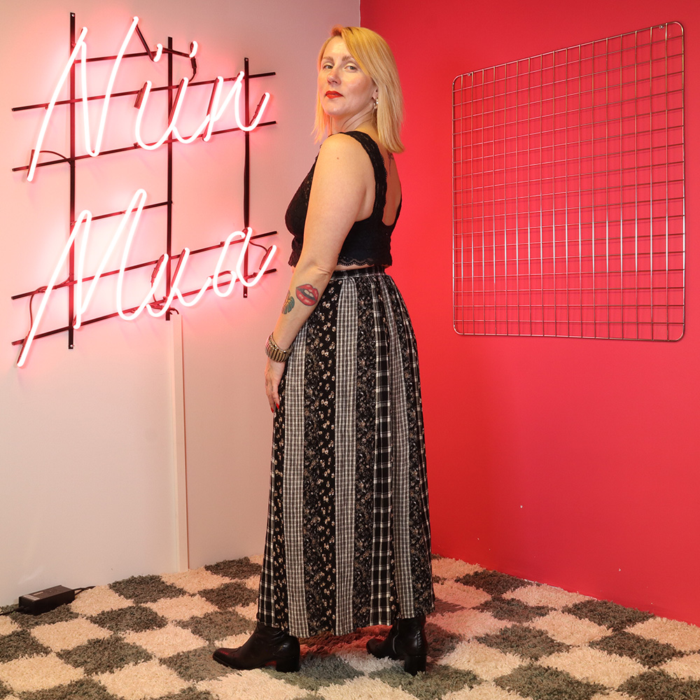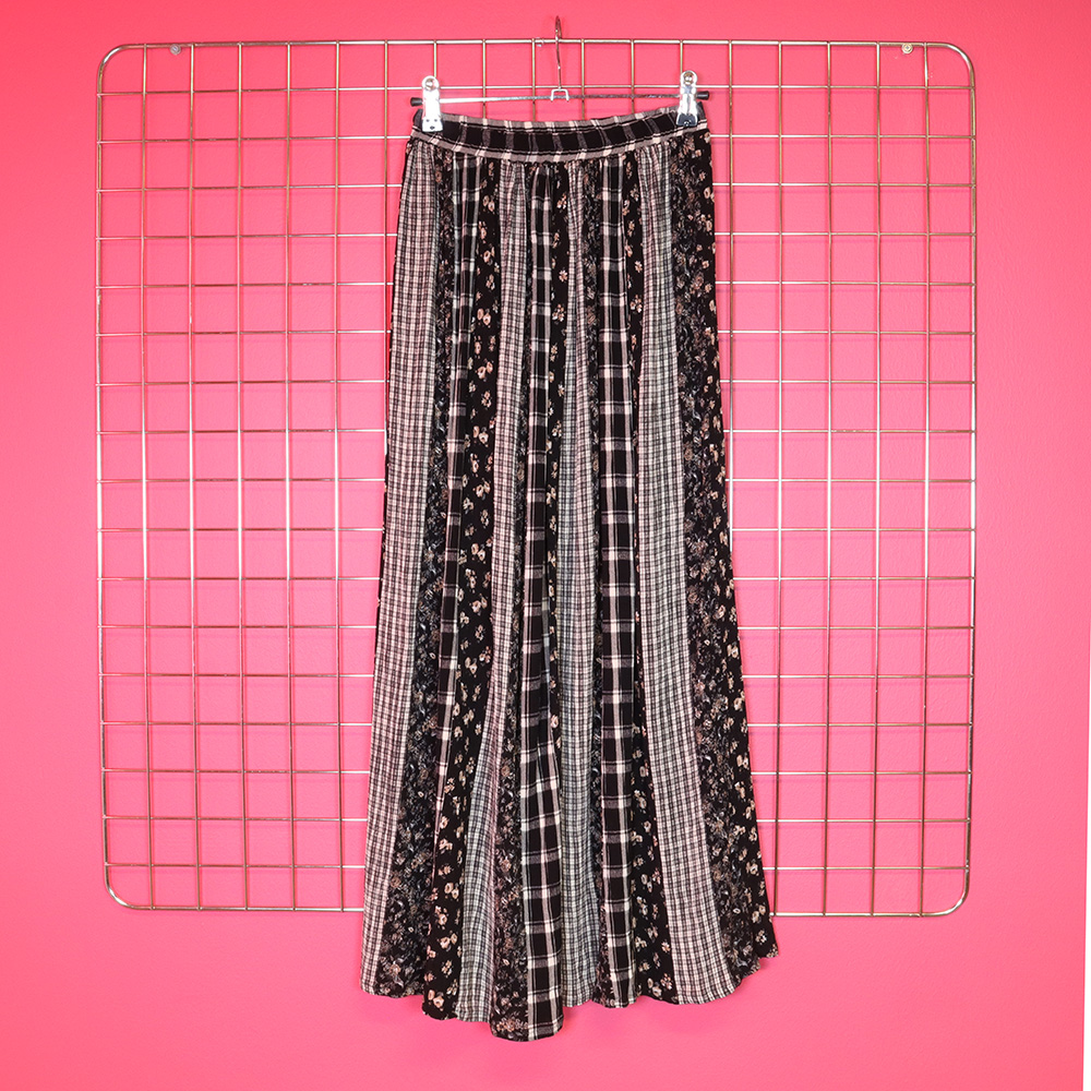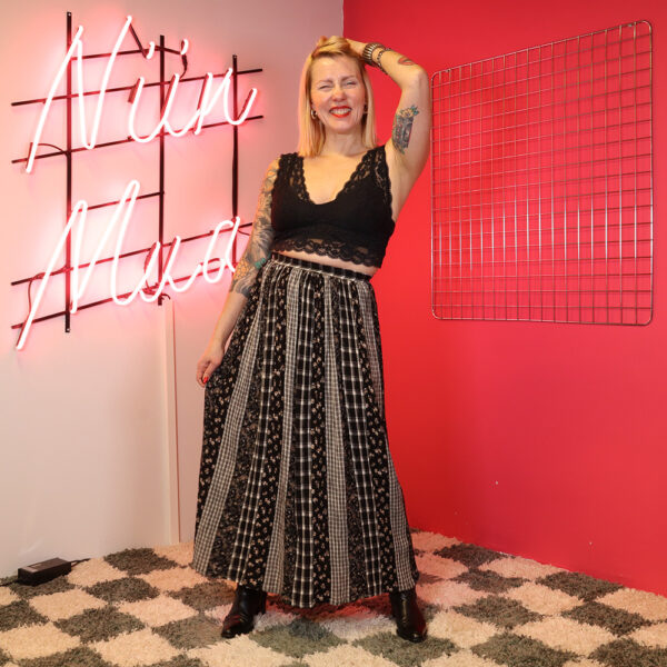 Seppälä Oy:n Martinelli-tuotemerkille 90-luvulla valmistama järkyttävän hieno pitkä kesähame. Valmistettu kauniisti laskeutuvasta, hengittävästä ja helppohoitoisesta, krepatusta viskoosikankaasta, jossa kaunis bohohenkinen kuosi. Kuosissa vaihtelevat ruutukuosit ja kukkakuosit, pääväreinä musta ja valkoinen. Täysipitkä hamemalli, jossa vyötäröllä kuminauha. Erittäin hyväkuntoinen ja kaunis pitkä kesähame!