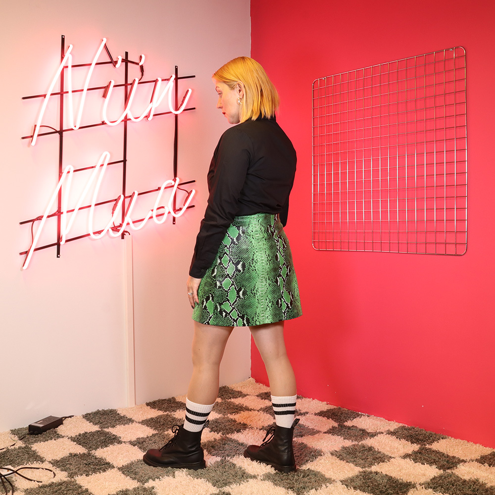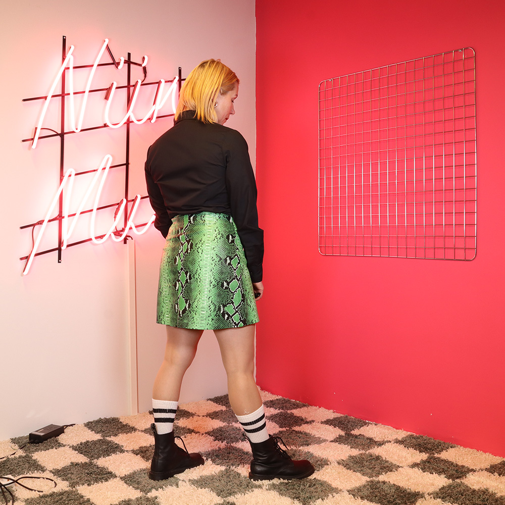Järkyttävän hieno matelijakuosinen PVC-hame 90-luvulta. Valmistettu Kiinassa. Valmistettu nahkajäljitelmästä, jossa matelijakuosi. Kuosin väreinä vihreä, musta ja valkoinen. A-linjainen malli, jossa keskiedussa nepparikiinnitys. Erittäin hyväkuntoinen PVC-hame ympärivuotiseen käyttöön!