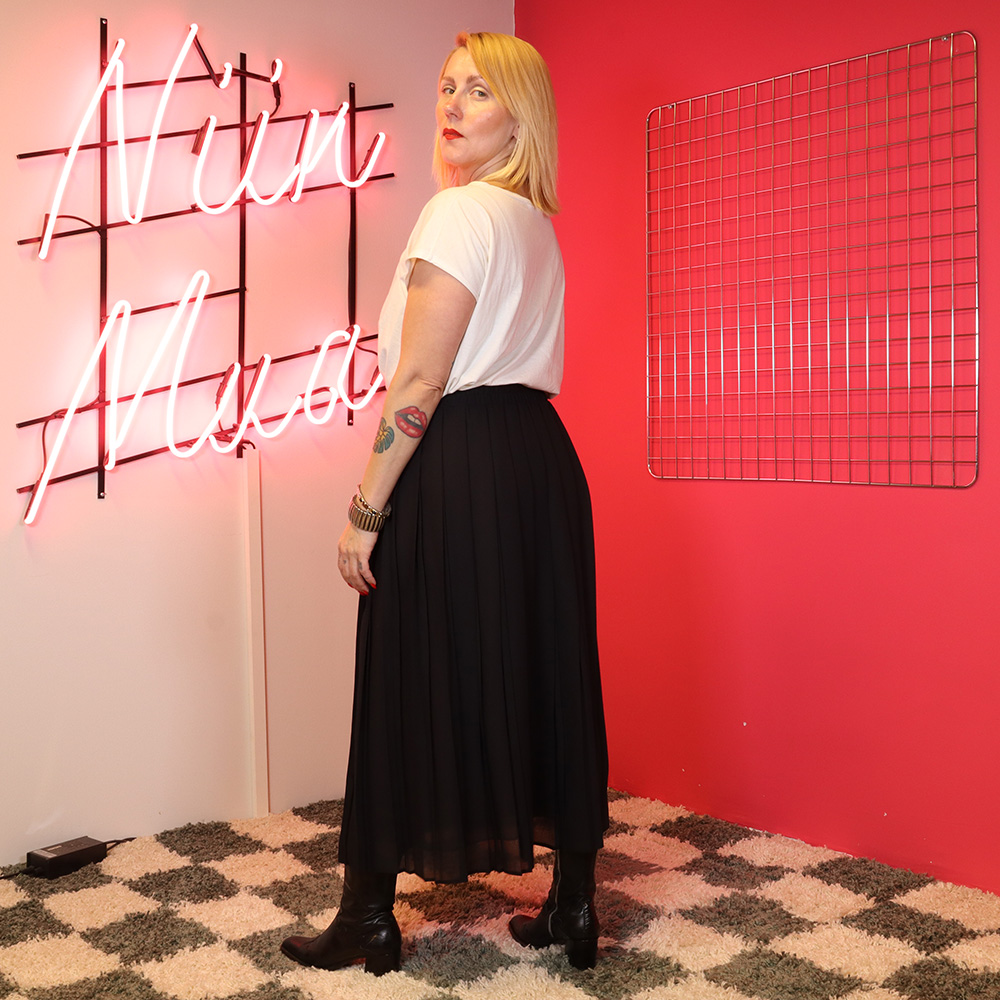 Kokomerkintä 42. Kuvan malli on 158 cm ja käyttää yleensä kokoa 36/38 – mallille liian väljä. Tarkemmat kokotiedot alla.