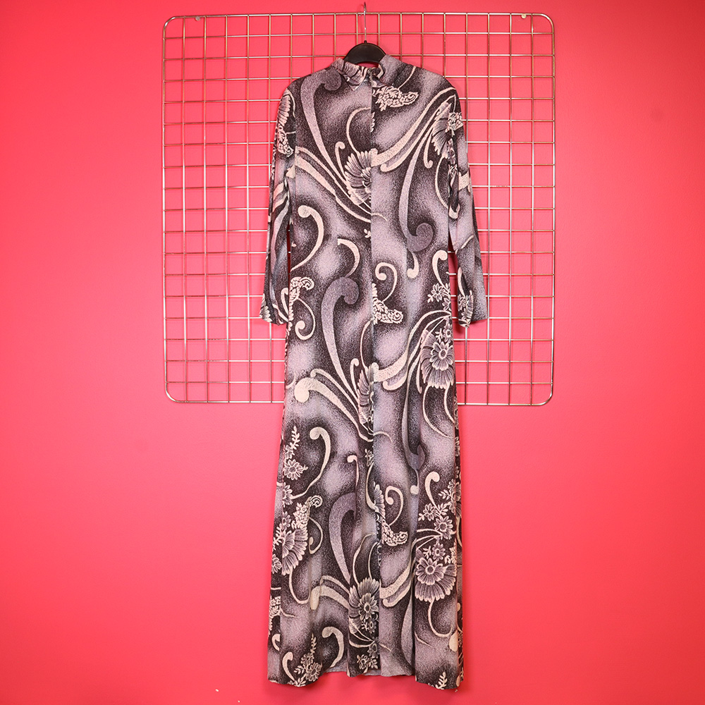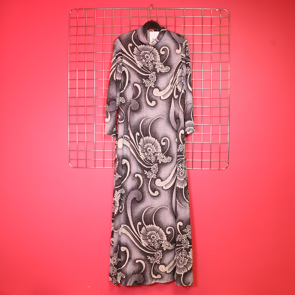 Todella hurmaava, Muoti-Hovin Riihimäellä valmistama pitkähihainen maksimekko 70-luvulta. Valmistettu sileästä, hieman joustavasta sekoitetrikoosta, jossa kaunis graafinen kukkakuosi. Kuosin sävyinä musta, valkoinen, ja laventeliin taittava harmaa. Täyspitkä ja pitkähihainen mekkomalli, jossa piippukaulus. Muotolaskokset rinnalta vyötärölle ja takaolalla. Kiinnitys niskasta pitkällä muovivetoketjulla. Vuoritettu hihaa lukuun ottamatta. Vuori värjääntynyt. Muutoin erittäin hyväkuntoinen, kaunis ja hurmaava maksimekko 70-luvulta!