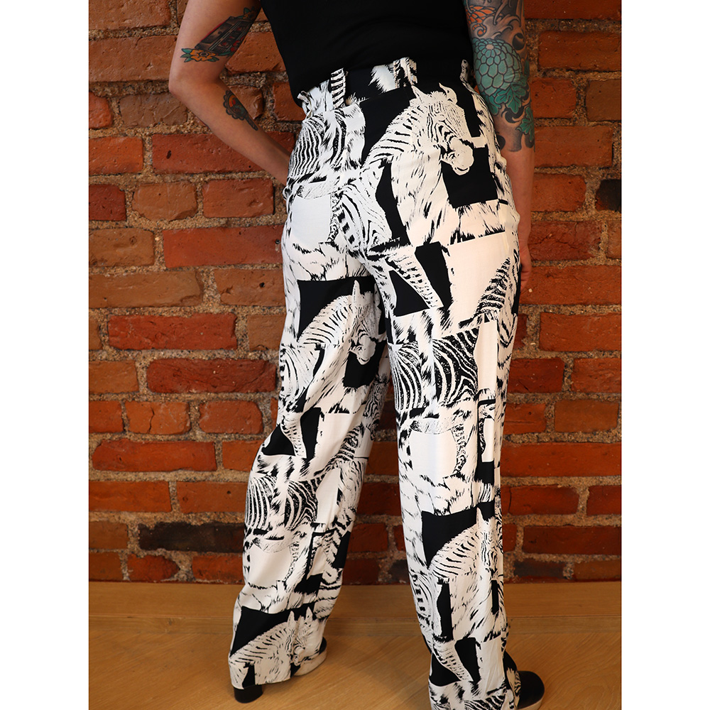 N+L Fashion for You -merkkiset kauniit ja raikkaat viskoosihousut 90-luvun alusta. Valmistettu Saksassa. Valmistettu kauniisti laskeutuvasta ja hengittävästä viskoosikankaasta, jossa valkoisella pohjalla musta eläinaiheinen kuosi. Upea, suoralahkeinen rento, mutta tyylikäs malli. Etukappaleella avolaskokset ja sivutaskut. Osittain kuminauhoitettu, leveä vyötärökaitale. Erittäin hyväkuntoiset kauniit ja näyttävät viskoosihousut kesäpäivään tai -juhlaan!