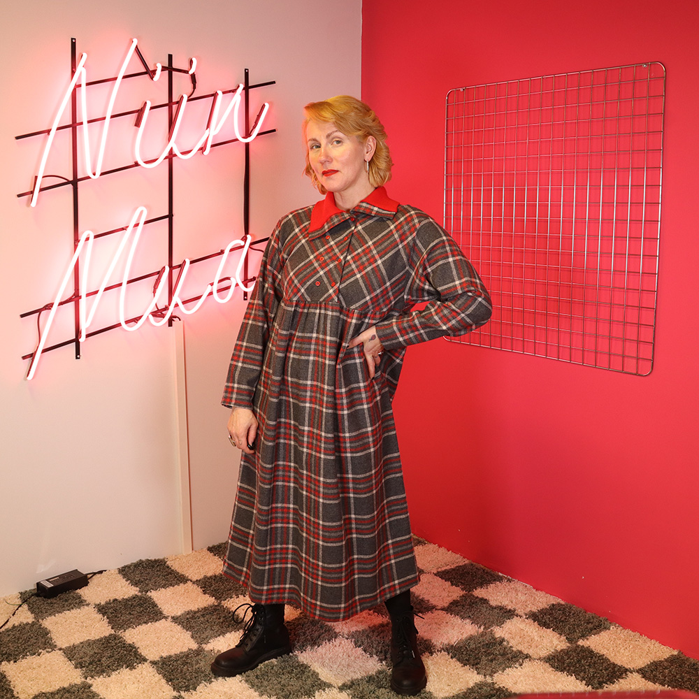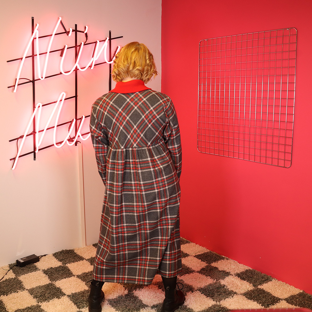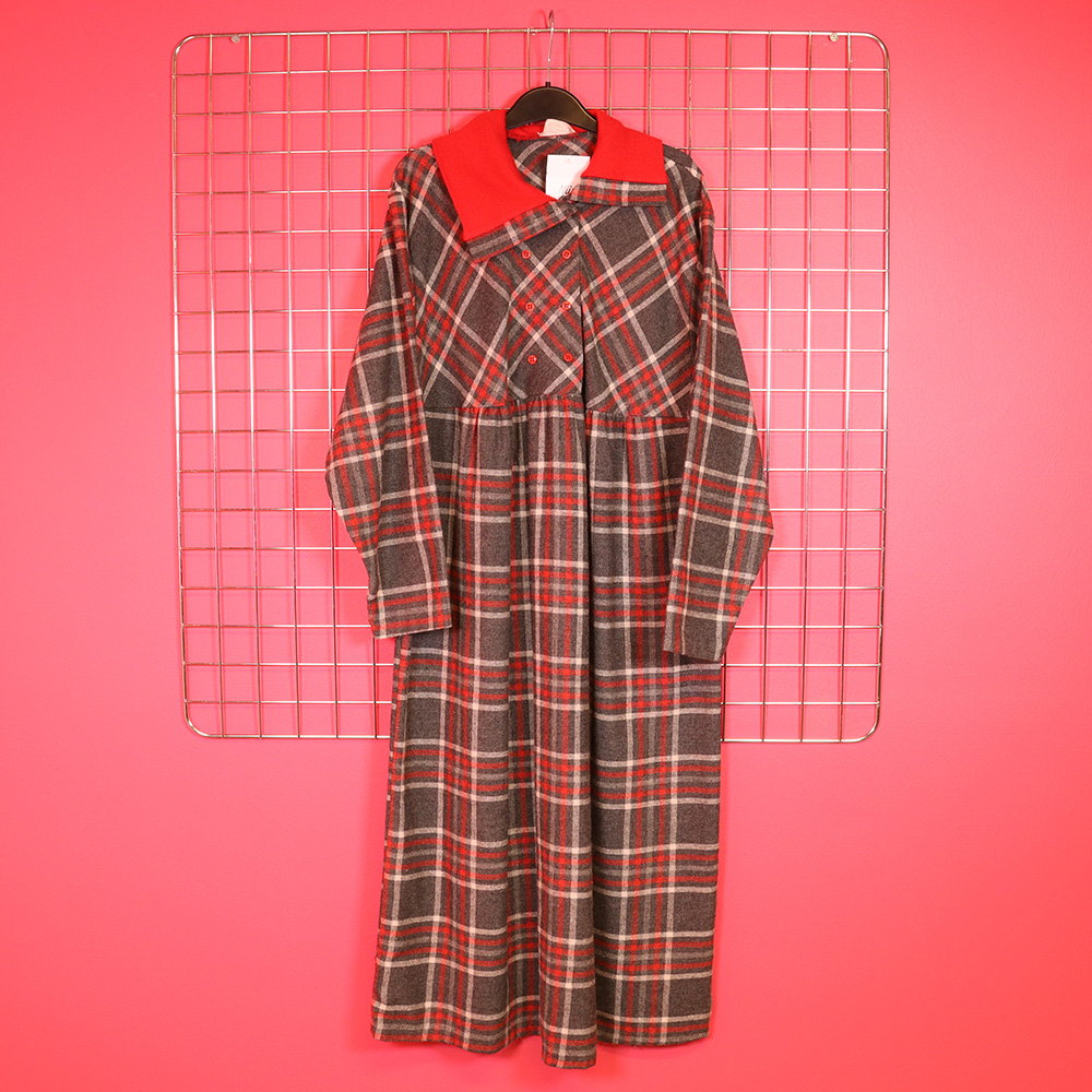 Ihana, Pia&Paula -tuotemerkin Suomessa valmistama odotusajan mekko 70/80-luvulta. Valmistettu pehmeäpintaisesta ja lämpimästä sekoitekankaasta, jossa ajaton ruutukuosi. Pohjaväri harmaa. Ruutukuosin sävyinä punainen ja valkoinen. Vajaamittainen, odotusajan mekkomalli, jossa laskostettu leikkaus rinnan alla. Pitkät hihat. Kaksirivinen napitus pääntieltä poikkileikkaukselle. Kauluskäänne punaista joustinneulosta, voidaan käyttää kauluskäänteenä tai poolokauluksena. Erittäin hyväkuntoinen ja hurmaava odotusajan mekko 70/80-luvulta!