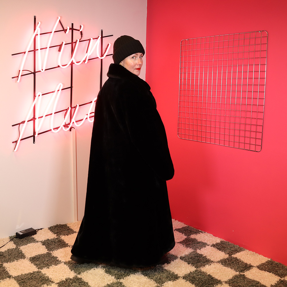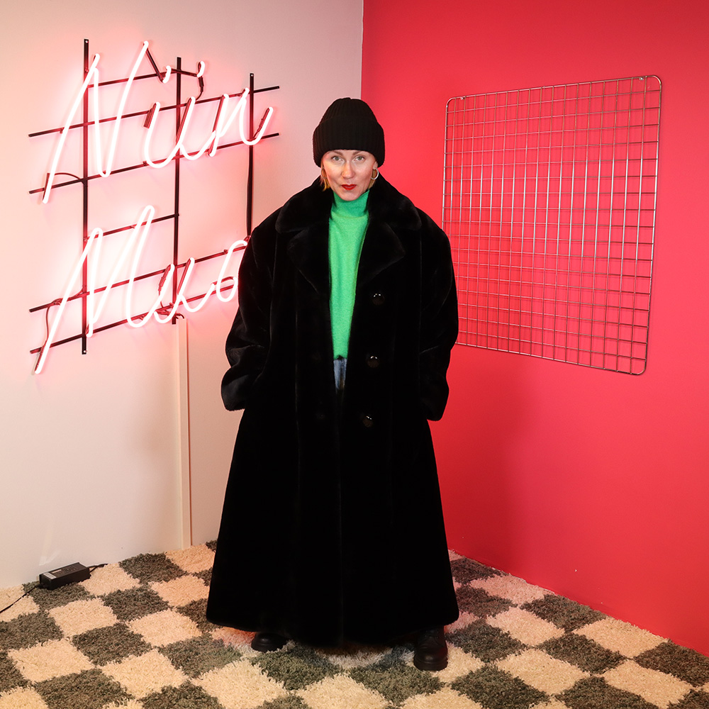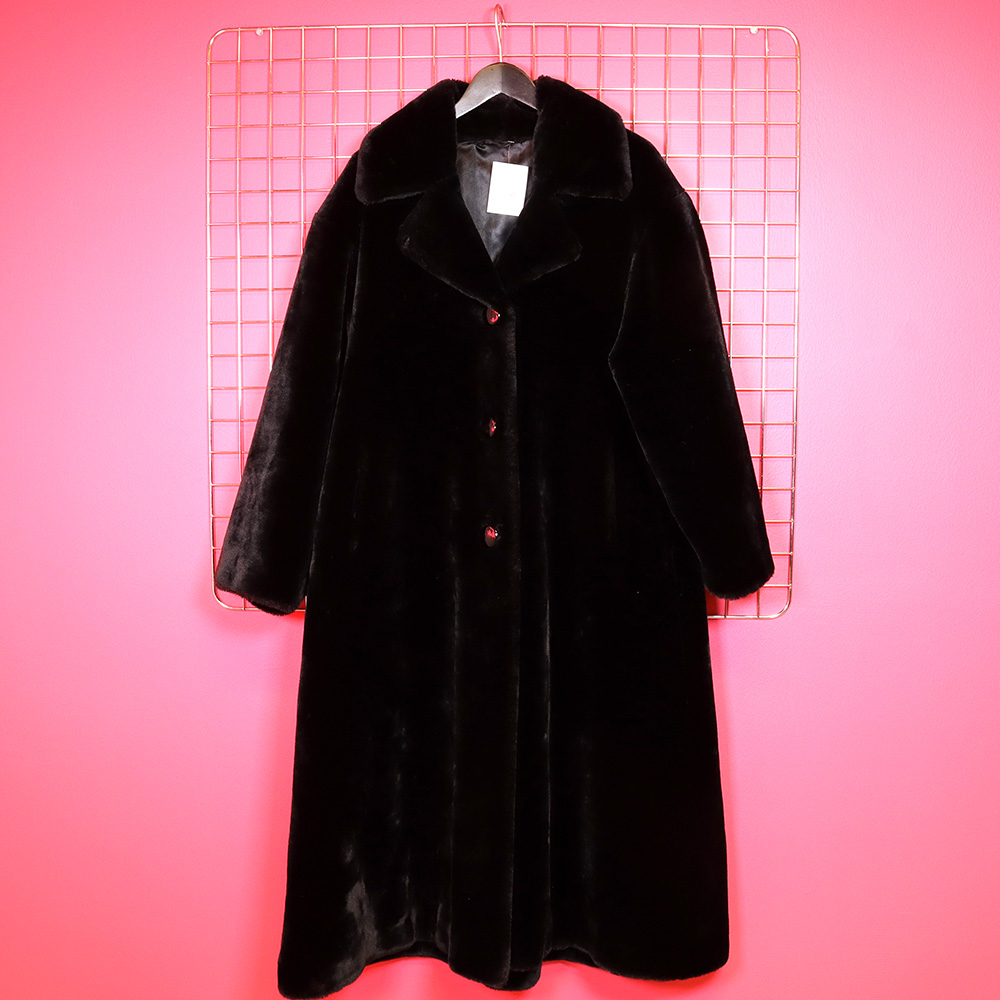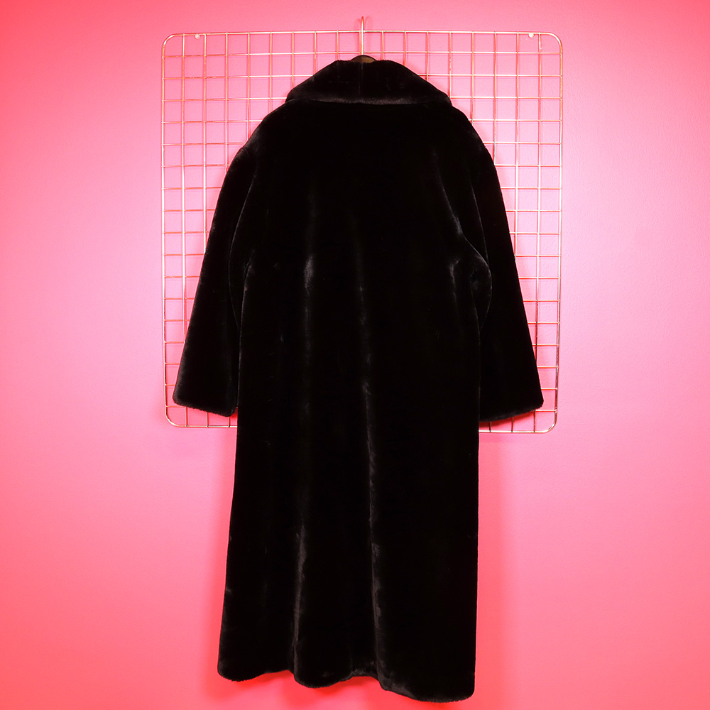Näyttävä, pitkä tekoturkki 90-luvulta. Ei valmistaja-/valmistusmaatietoja. Valmistettu mustasta, himmeästi hohtavasta tekoturkiksesta. Näyttävä täyspitkä, hieman  A-linjainen malli. Kauluskäänne ja sivutaskut. Kokonaan vuoritettu. Kauluksen alla piilohakaskiinniyts,  muutoin yksirivinen nappikiinniyts. Erittäin hyväkuntoinen, kaunis ja lämmin pitkä tekoturkki talvikäyttöön!