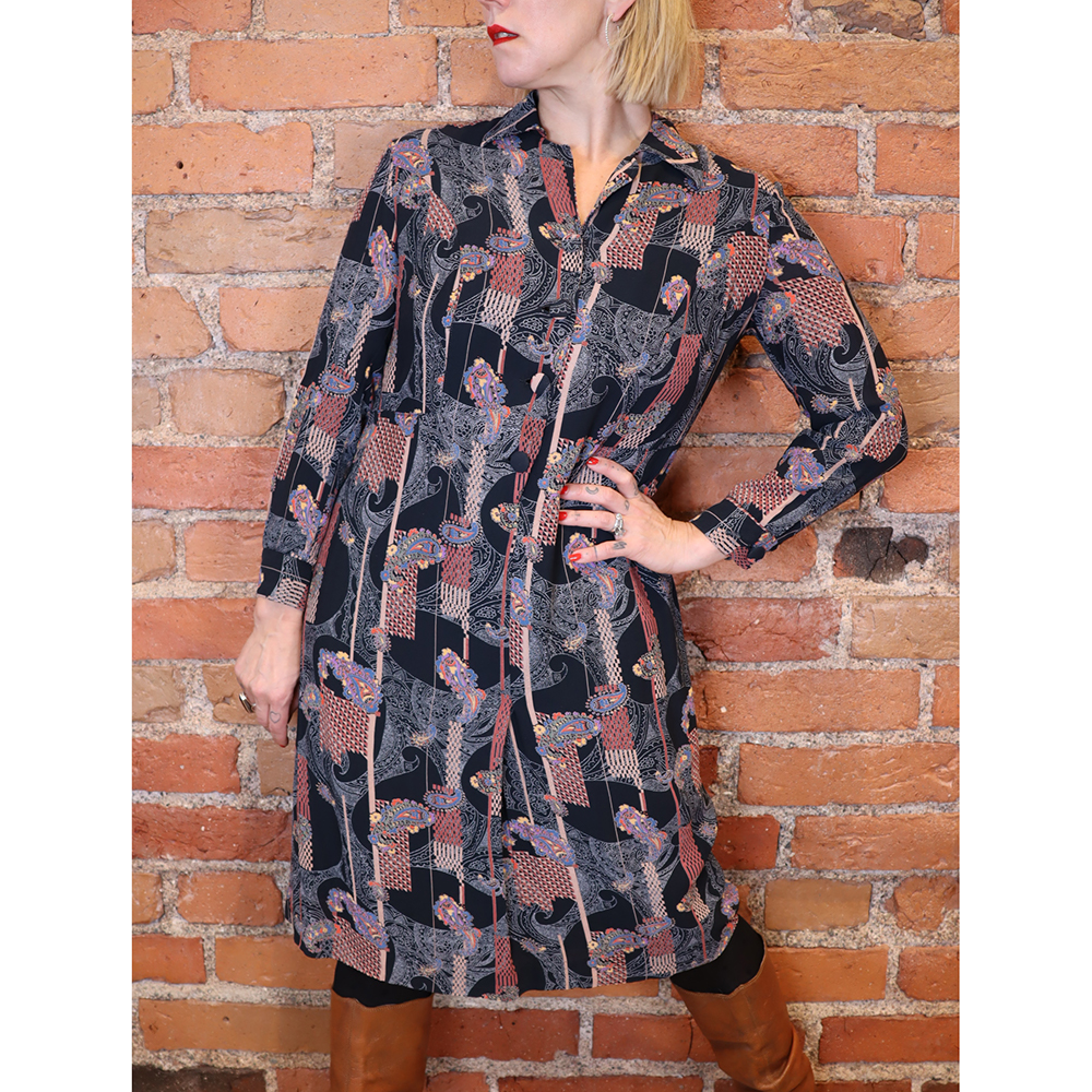 Kaunis ja ajaton pitkähihainen mekko todennäköisesti 1970-luvulta. Tuotetietolapun kaikki tiedot kuluneet pois. Valmistettu kauniisti laskeutuvasta ja hengittävästä viskoosista, jossa mustalla pohjalla pieni ornamentti-/paisley-kuosi. Kuosin pääsävyinä beige, poltettu oranssi, vaalea harmaa ja sininen. Ihana paitamekkomalli, jossa pieni kauluskäänne. Kiinnitys keskiedusta päällystetyillä napeilla. Myös hihansuunkäänteillä kiinnitys päällystetyillä napeilla. Kevyesti A-linjainen malli, jossa helmassa laskostus. Miehustaosa kokonaan vuoritettu. Toisella hihansuunkäänteellä pieni nirhauma, muutoin hyväkuntoinen, kaunis ja ajaton pitkähihainen mekko arki- tai juhlakäyttöön!
