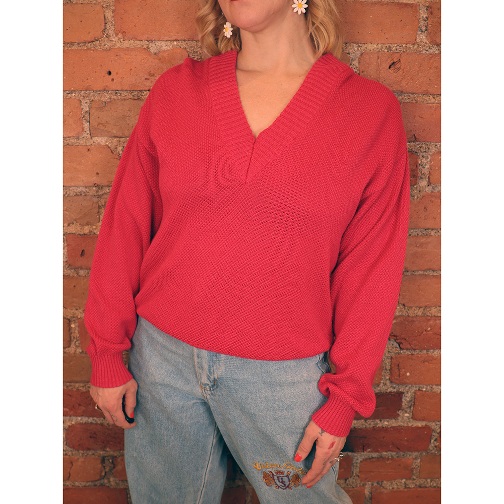 Pitti-merkkinen vintage-neule 80-luvun lopulta / 90-luvun alusta. Valmistettu Tanskassa. Valmistettu kohoneuloksesta, jonka sävynä aniliininpunainen. Ajaton malli, jossa V-pääntie. Pääntiellä, helmassa ja hihansuissa joustinneulosta. Huomaamatonta nukkaa pinnassa, muutoin hyväkuntoinen ja kaunis vintage-neule ympärivuotiseen käyttöön!