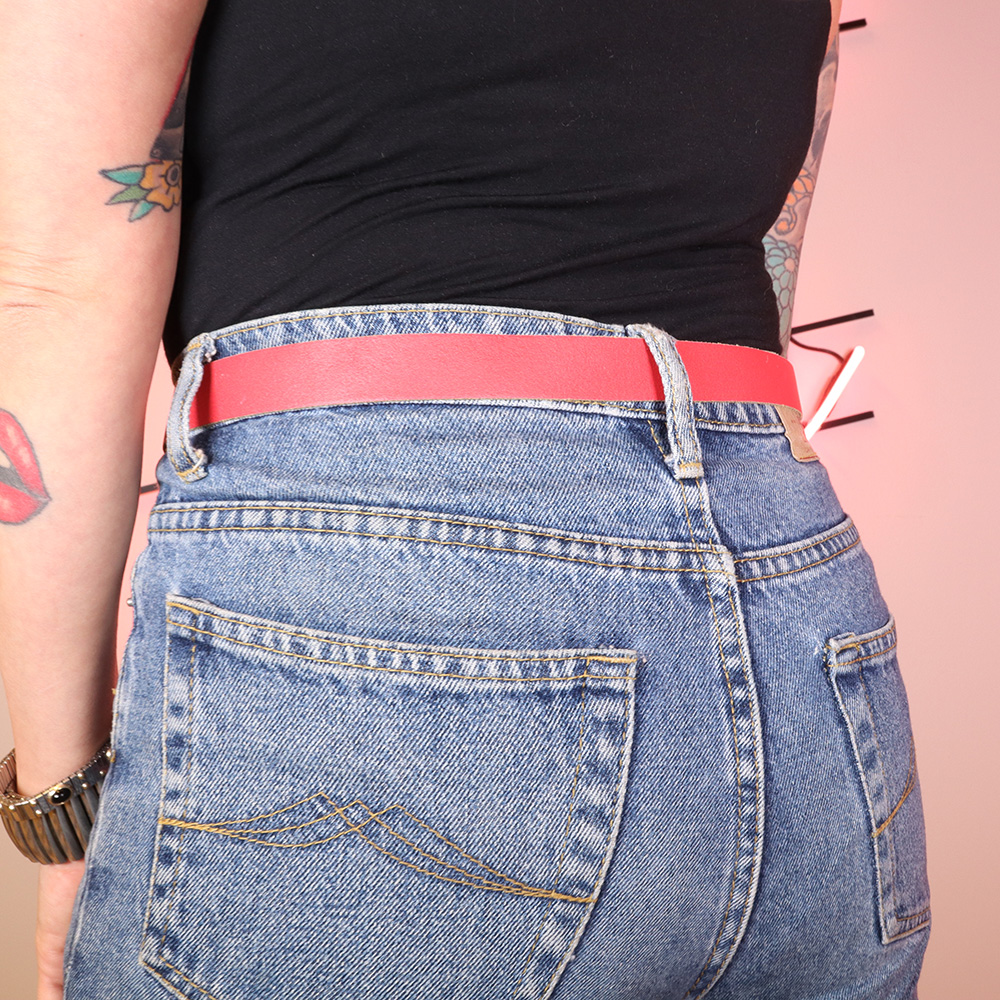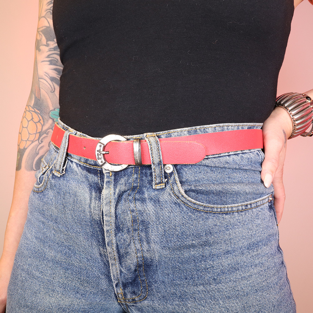 Kaunis, punainen nahkavyö 70-luvulta. Valmistettu punaiseksi värjätystä nahasta. Hopeanvärinen, koristeellinen solki. Soljessa runsaasti patinaa, muutoin ikäisekseen erittäin hyväkuntoinen punainen nahkavyö.