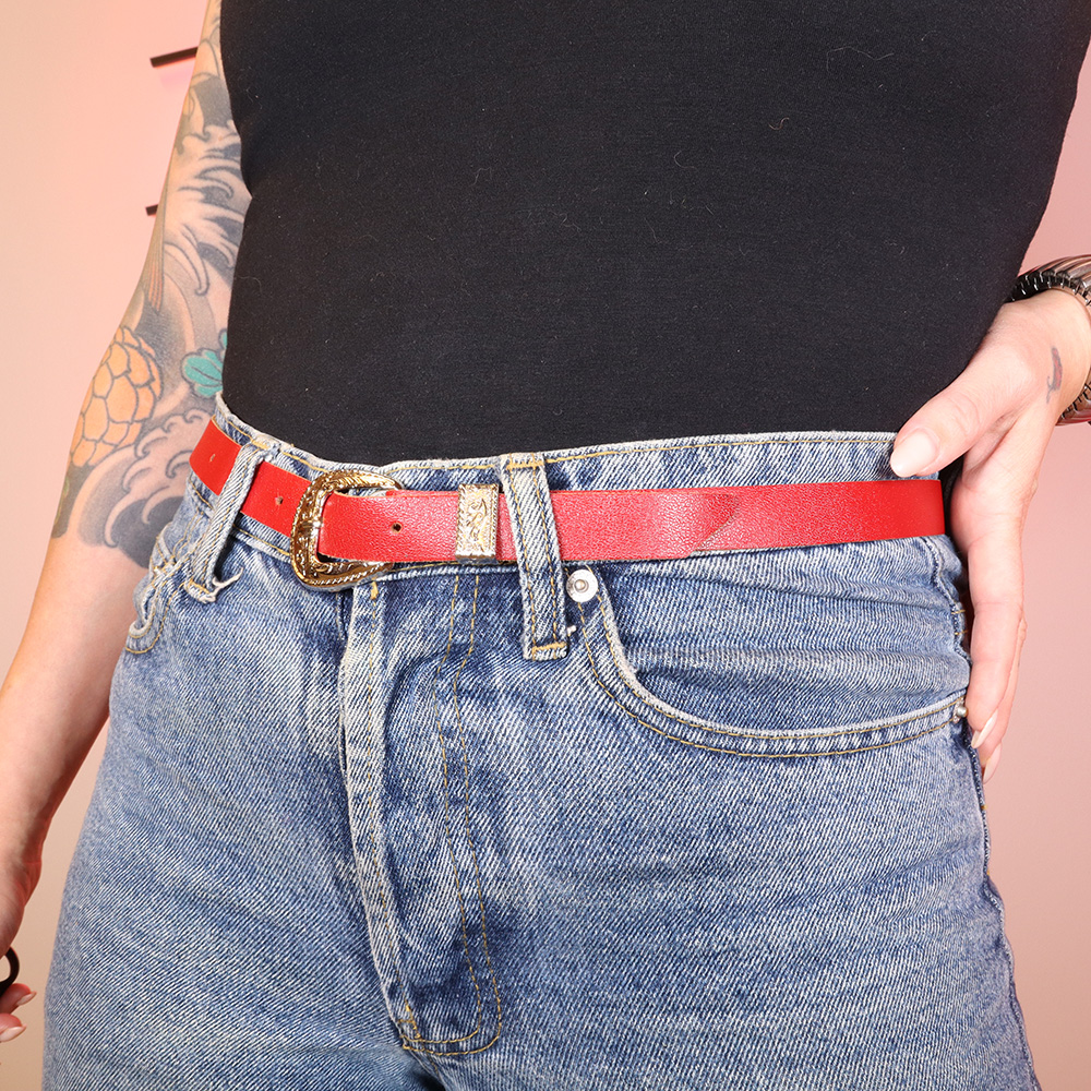 Kaunis, punainen nahkavyö 70-luvulta. Valmistettu punaiseksi värjätystä nahasta. Hopeanvärinen, koristeellinen solki. Lähes uudenveroinen, punainen vyö nahasta.