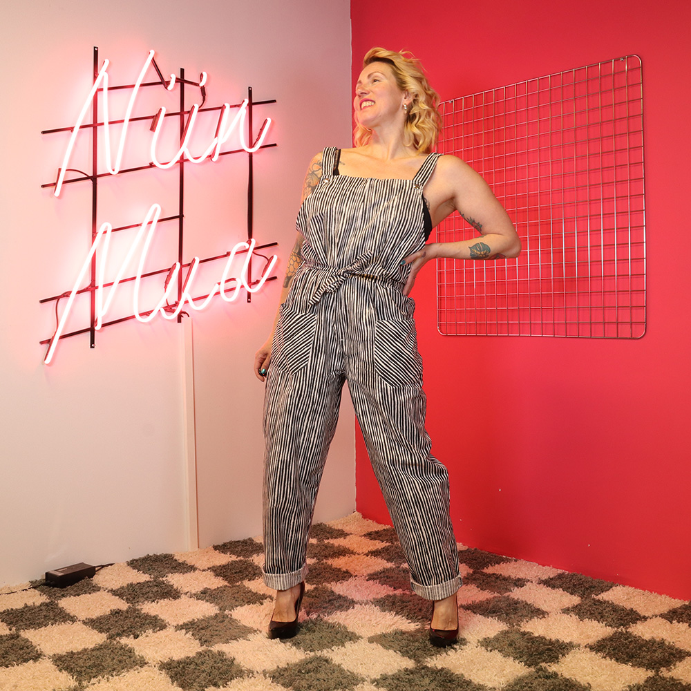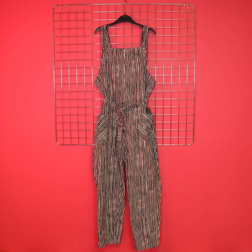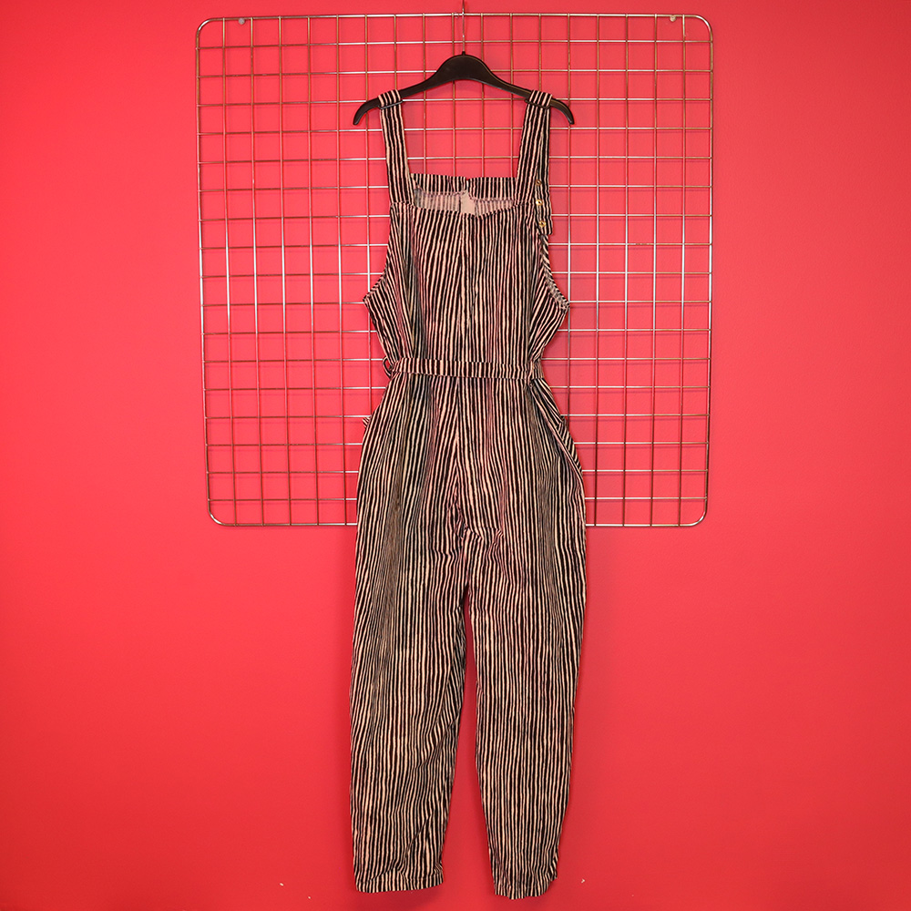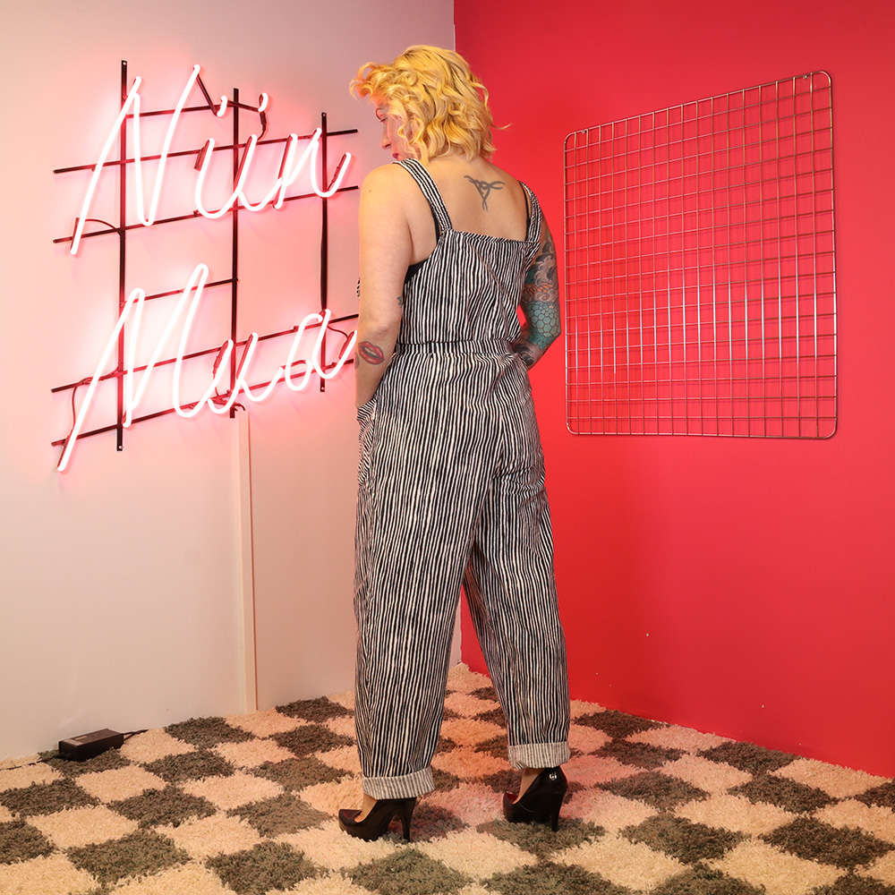 Järkyttävän upeat puuvillahaalarit 70-luvulta. Valmistajatiedot kuluneet pois. Kangas muistuttaa / on Marimekon varvunraita-kuosinen; valkoisella pohjalla musta, orgaaninen raitakuosi. Ajaton lappuhaalarimalli, jossa vyötärökorkeudella solmittava vyö. Etutaskut. Kiinnitys vetoketjulla keskiedusta. Henkseleiden kiinnitys neppareilla, säätövara. Olkaimien kuminauhat kevyesti löystyneet, mutta täysin käyttökelpoiset ja todella siistikuntoiset puuvillahaalarit arkeen ja juhlaan!