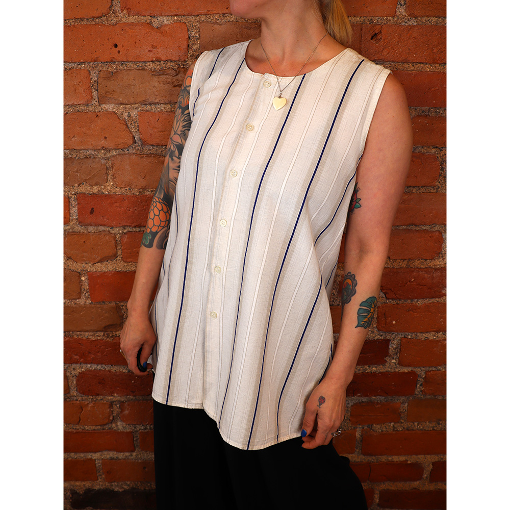 Rancher-merkkinen pitkä puuvillatoppi 80/90-luvulta. Ei valmistus-/materiaalitietoja. Toppi todennäköisesti modifioitu alkuperäisestä mallista hihattomaksi. Valmistettu hengittävästä ja ilmavasta puuvillakankaasta, jossa luonnonvalkoisella pohjalla pystyraitakuosi-/struktuuri. Raitojen värinä beige ja sininen. Ihana kevyesti alaspäin levenevä malli, joka on lähes tunikamittainen. Kiinnitys koko keskietuuden pituudelta napeilla. Erittäin hyväkuntoinen ja raikas pitkä puuvillatoppi kesäkäyttöön!